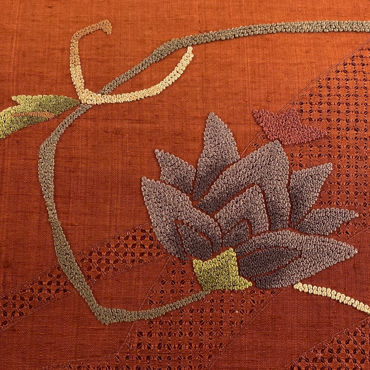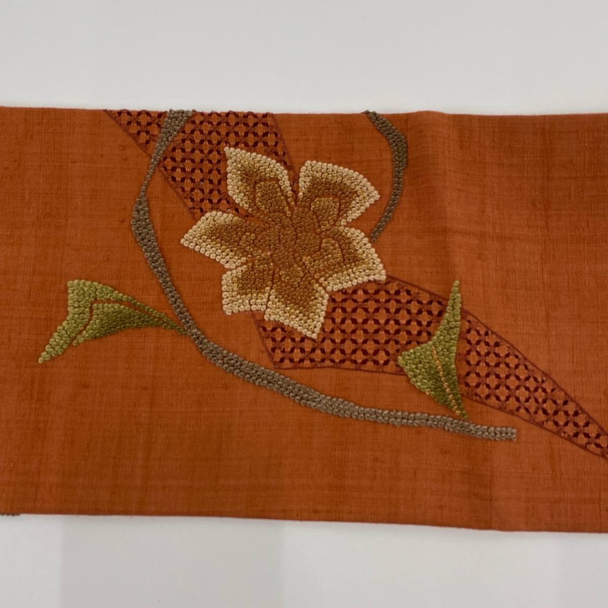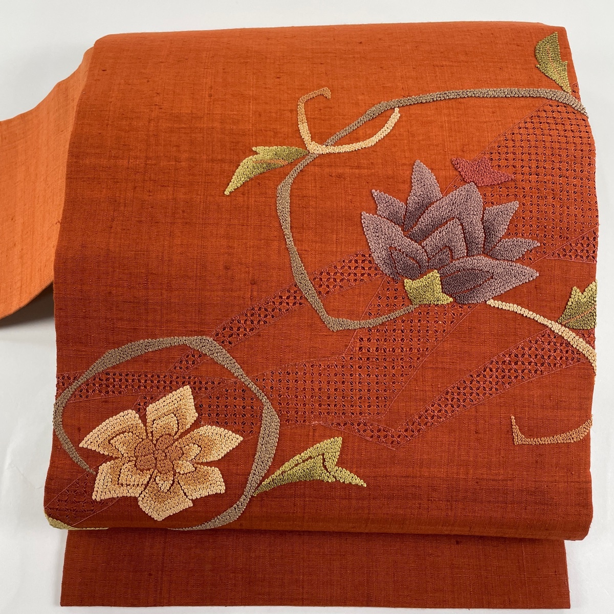 | 名古屋帯 美品 秀品 紬地 草花 刺繍 赤茶 正絹 【中古】 |