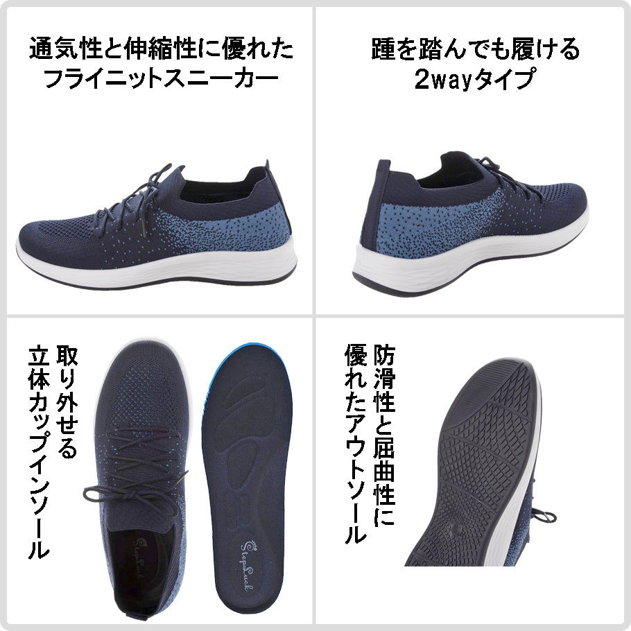踵を踏んでも履ける 2way タイプのスリッポンで脱ぎ履きかんたん、上履きとしても使用でき、医療・介護など脱ぎ履きの多い職場や生活にも活躍してくれます。