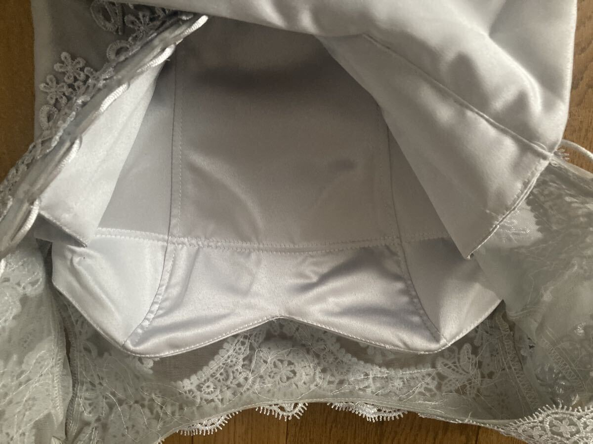 細身体型のため、胸部は紐で絞っても当方には大きかったので内側を安全ピンでとめていたため、内側にピンの跡があります。内側のインナーは透けないサテン素材でできています。