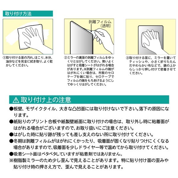 割れないフィルムミラー(吸着式、壁紙へ貼り付け可能)