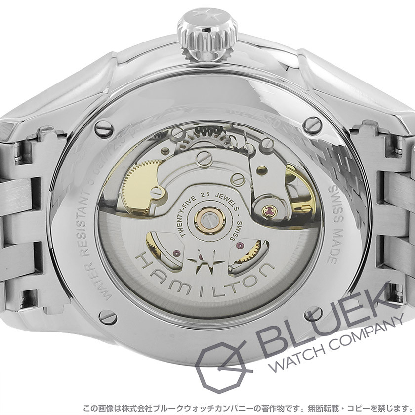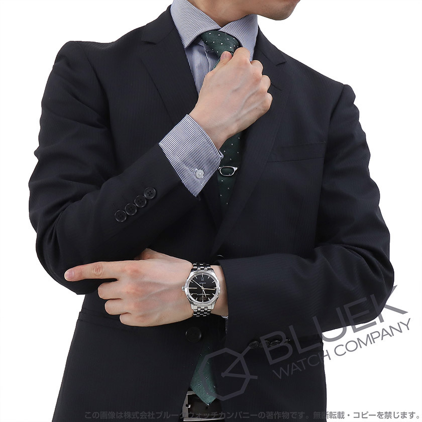 | ブラックダイヤルにシルバーのミニッツスケール外周を配した厚さ11ミリの40ミリケース&5連ブレス重さ150グラムの着け心地もなめらかなジャズマスターオートは、スッキリとした表情が男性の腕をシックに引き締めるハミルトン人気のタイムピース。耐磁性に優れるNivachron製ヒゲゼンマイを採用した80時間パワーリザーブの自動巻きムーブメントcal.H-10を搭載して6時の窓に日付を表示し、シルバー指針とくさびには蛍光塗料が塗布されて暗所でも視認性を発揮します。中でもシンプルなデザインが幅広い装いにマッチして使い勝手に優れるこのモデルは、プッシュ式の両開きバックルも魅力。ケースバックからは機械の意匠が鑑賞できてメカ好きの目を楽しませます。 |