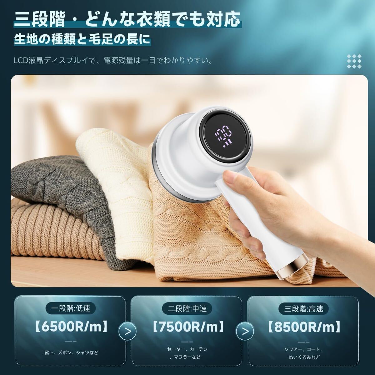 【3 段階速度調整機能を搭載し、あらゆる素材に対応】毛玉クリーナーは素材の種類と毛玉の長さに応じて、回転速度を低・中・高の 3 段階に調整可能です。衣類だけでなく、毛布玩具、寝具、ソファなどにも幅広く使用できます。精密な回転速度制御と安全な刃網設計により、「1 台で多機能」の万能機能を実現しています。