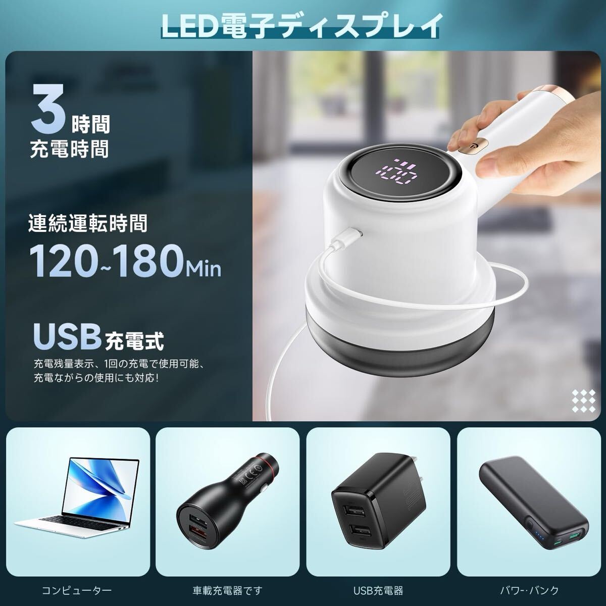 【USB 充電式&LED ディスプレイ】電動毛玉取り器は USB 充電式を採用し、LED ディスプレイを搭載しています。スイッチをオンにすると、バッテリー残量 / モード設定 / 充電状態が一目で確認できます!使用中に突然の電源切れやバッテリー残量が不明な状況に悩む必要はありません。
