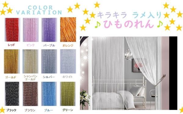 お部屋のスペースを有効活用したり、お好きなカラーで雰囲気を変えたりと、工夫次第でいろいろ使えるのが、このキラキラ ラメ入りのひものれん。 取り付け方法も楽々です♪