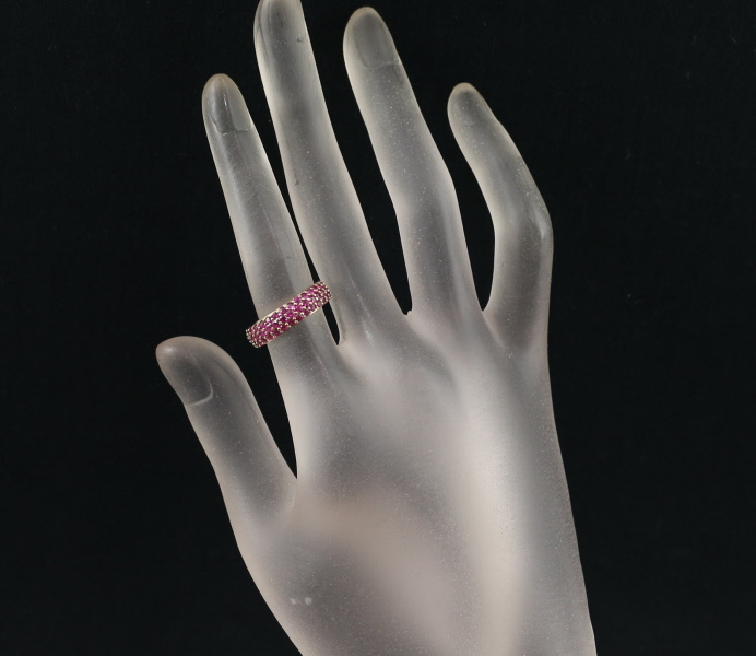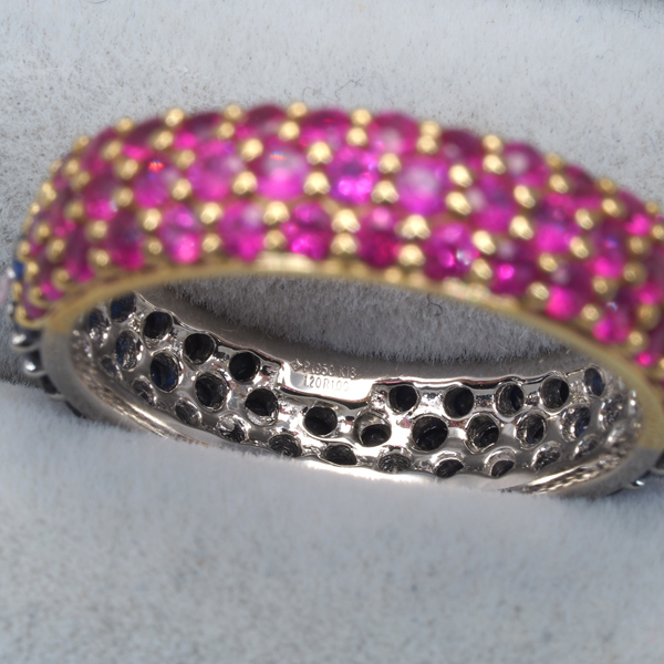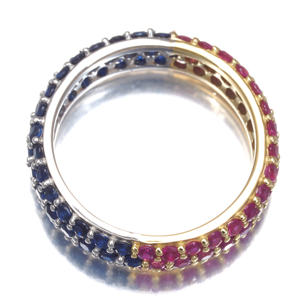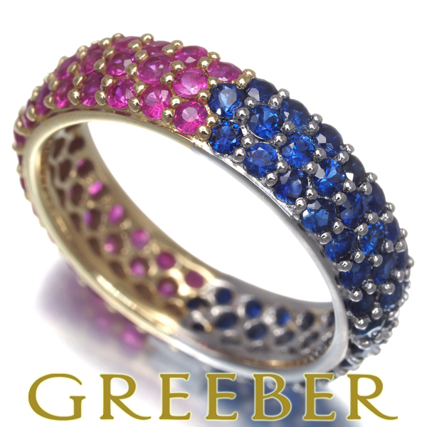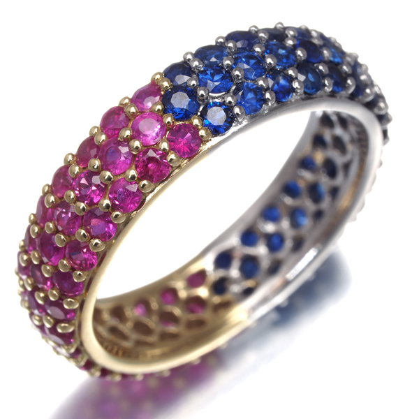 色鮮やかな輝きを演出するルビーとサファイアをフルパヴェで飾ったGSTVのリング。半分で分断された眩く美しい煌めきがお手元に華やかなアクセントを与えてくれます。 |