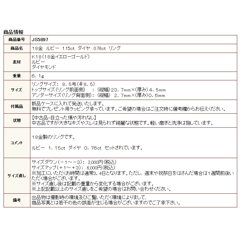 商品名 | 18金 ルビー 1.15ct ダイヤ 0.76ct リング |
