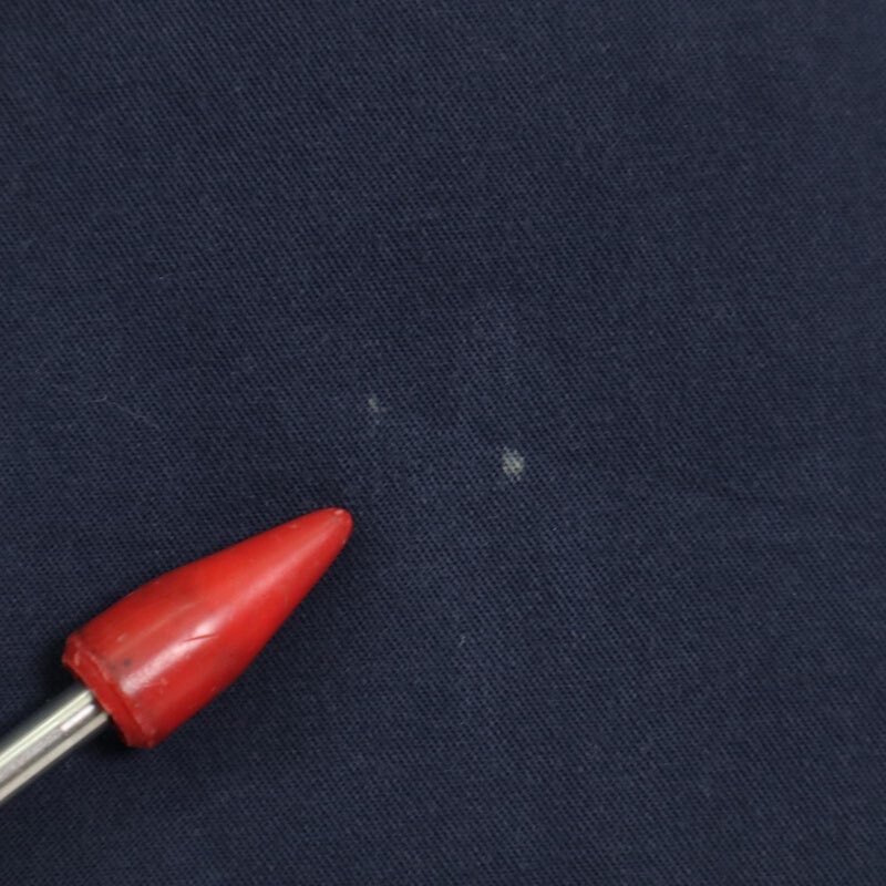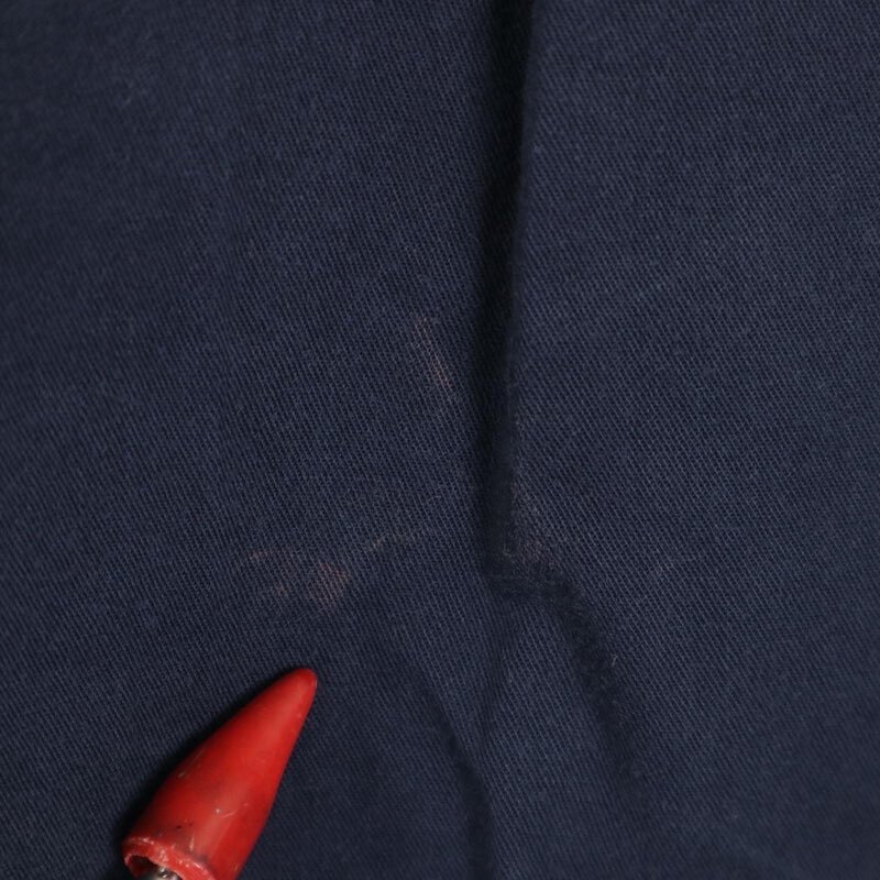 正面右襟にごくわずかな薄い傷、正面左下と後ろ中央にごくわずかな薄い変色がございます。着用に問題はございません。