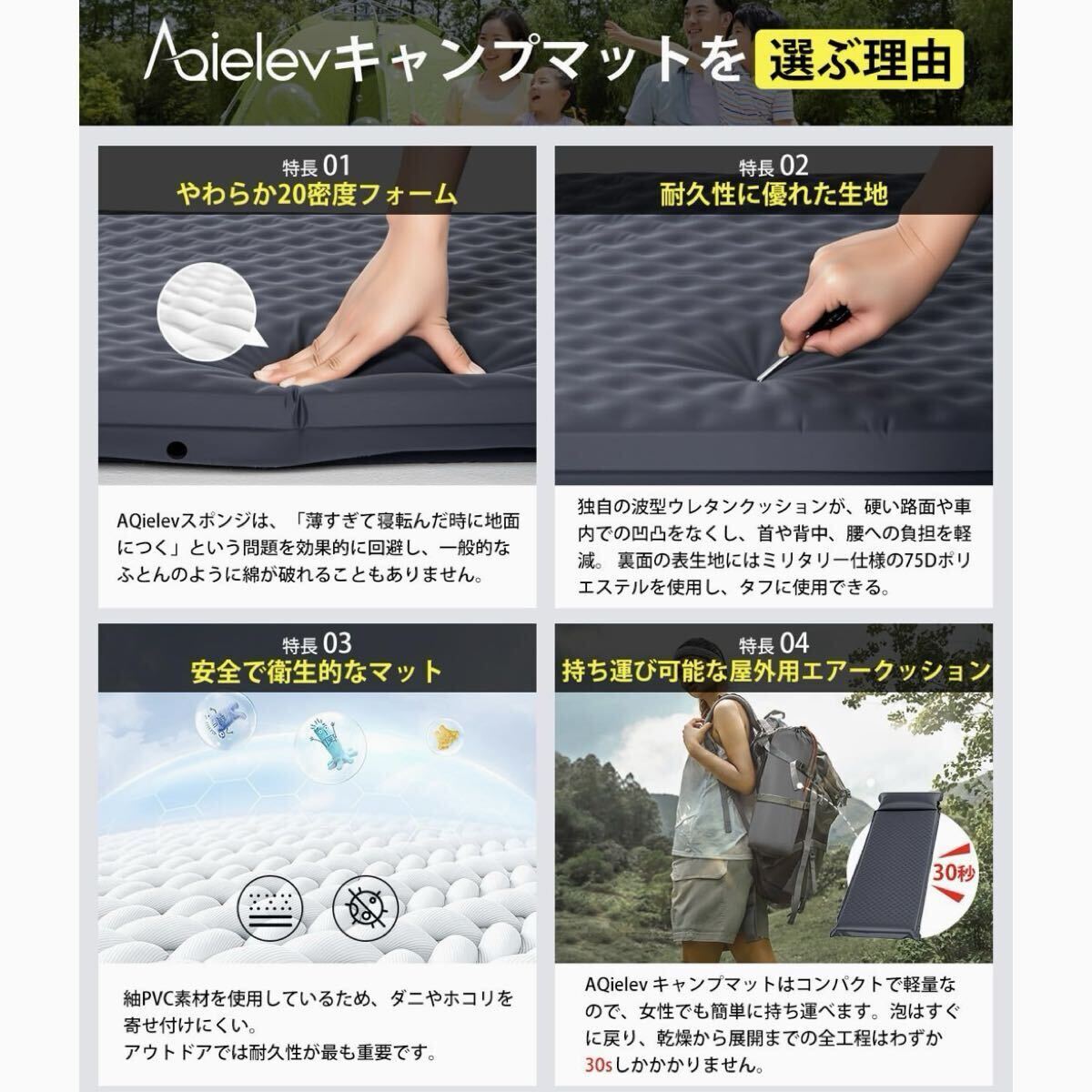 190TスポンジPVCと耐久性のあるポリエステル繊維でできた空気注入式マットレスは、非常に頑丈で防水性があり、尖った石や枝で破れる心配はありません。大雨の場合、湿ったタオルで拭くだけで内部への水分浸透を防げます。