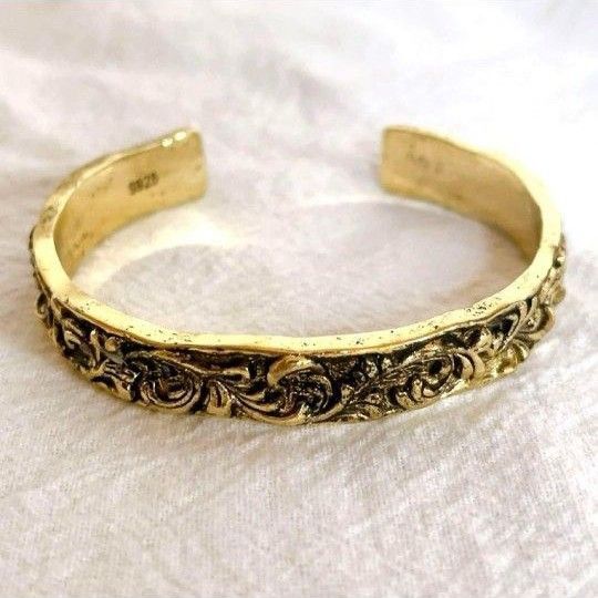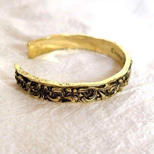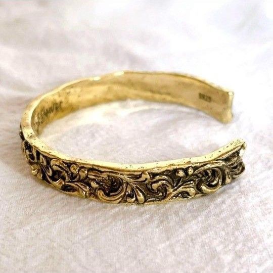 ごちゃごちゃしてないけど、ちゃんと存在感ある。そんなちょうどいいバングル見つけました。彫り模様がぐるっと入ってて、光の当たり方でちょっと表情変わる感じがいい。
