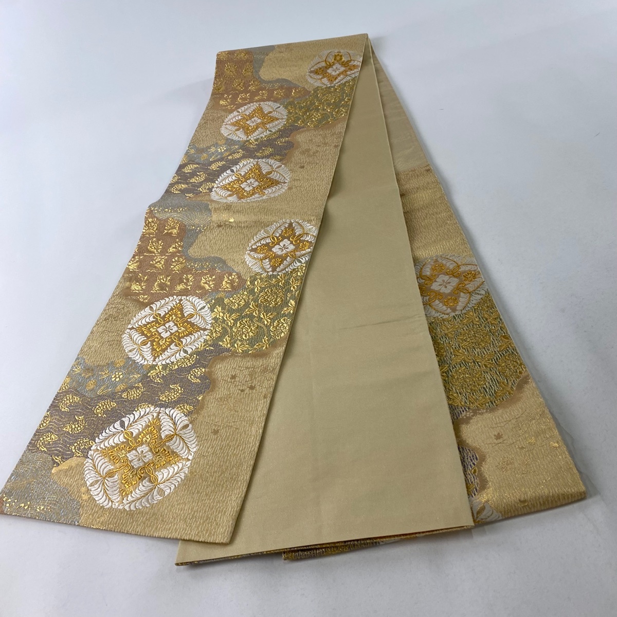 | 袋帯 美品 秀品 華文 花うさぎ 金糸 箔 ベージュ 六通 正絹 【中古】 |