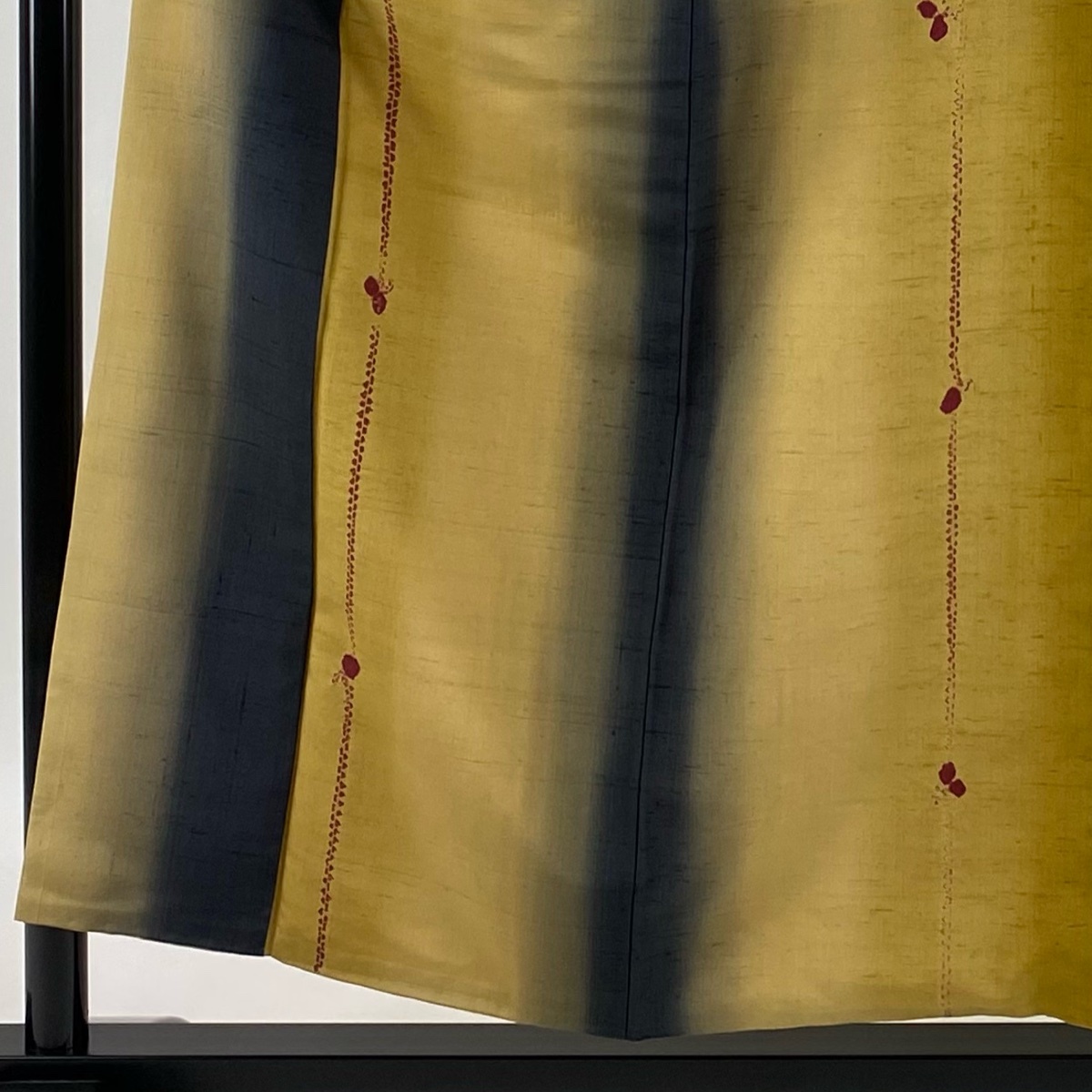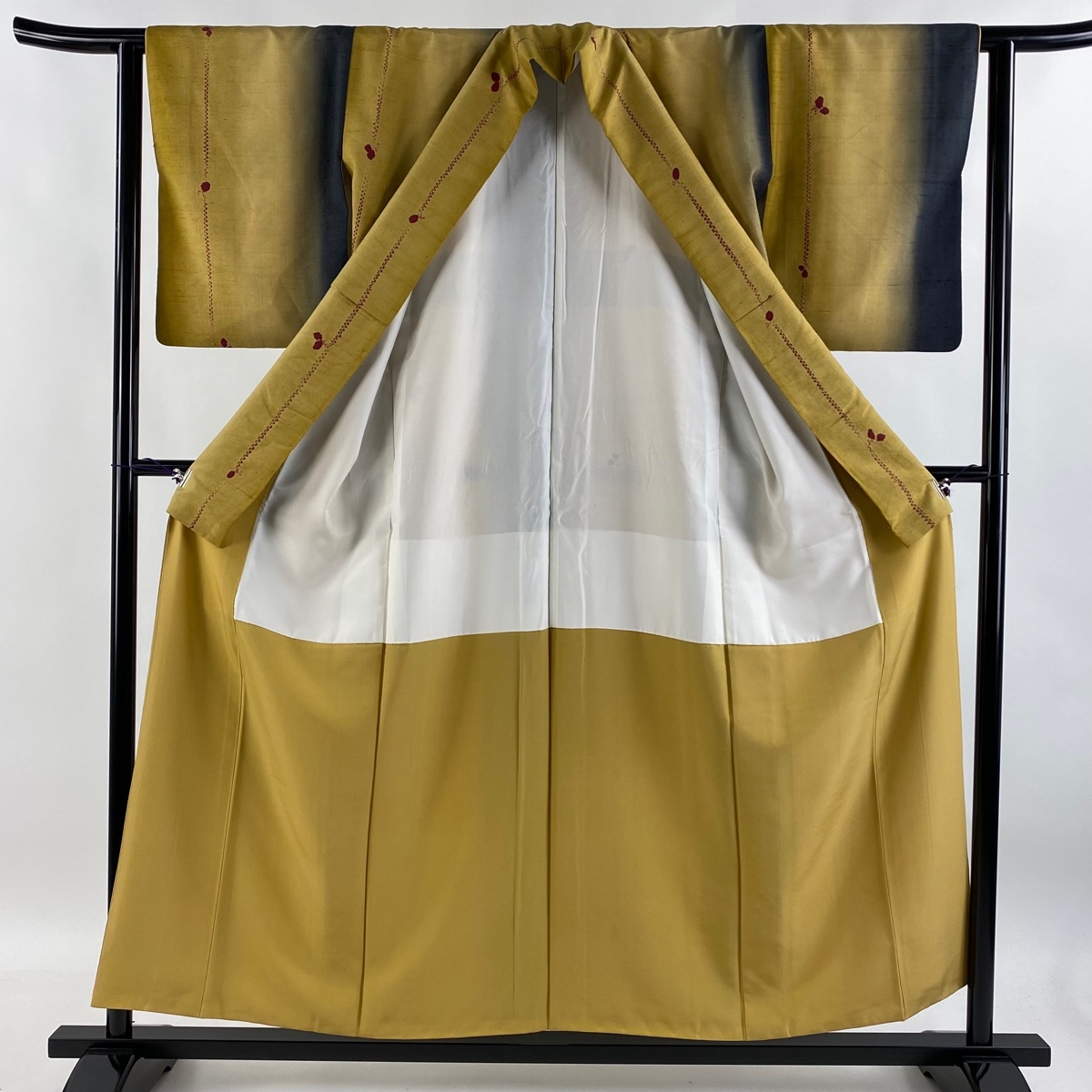 | 小紋 美品 名品 紬地 花 幾何学模様 縦ぼかし 黄土色 袷 身丈154 裄丈62 S 正絹 【中古】 |