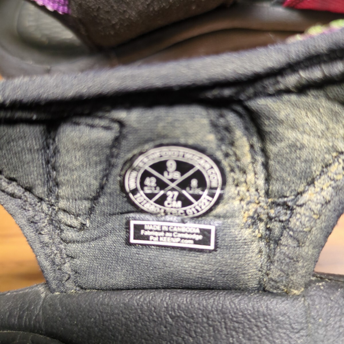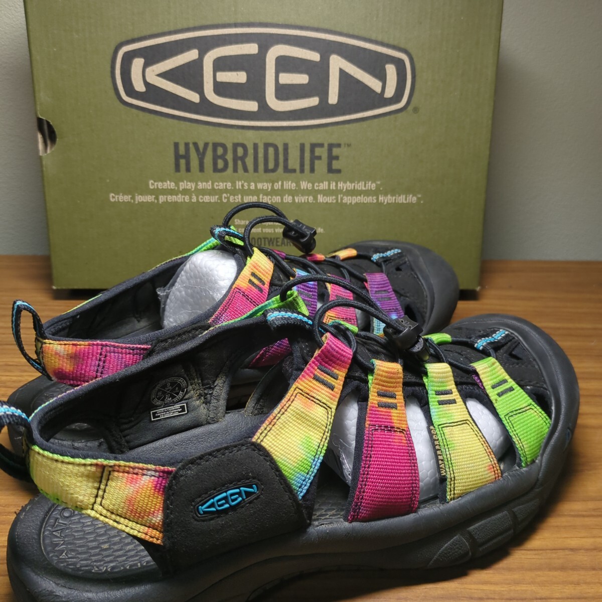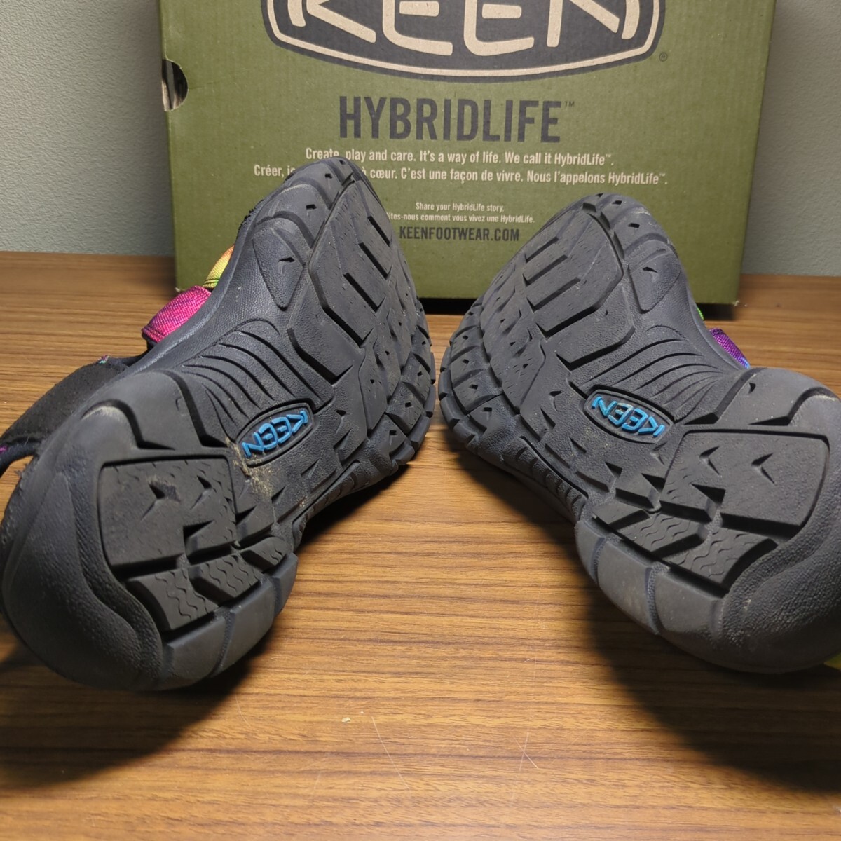 カラフルなデザインのKEEN サンダル、アウトドアに最適。