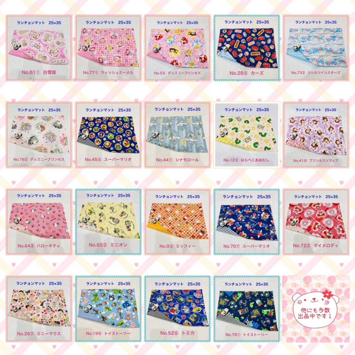 | ご覧いただきまして、ありがとうございます。 <商品詳細> サイズ 約25×35㎝ 裏地 なし ※ 素人のハンドメイドなので、多少のゆがみ・ずれ・縫い直し等がある場合がございます。ご理解いただける方のみ、ご検討お願い致します。 ※配送前はアイロンで生地整えますが、梱包後、多少の折りシワがつくかと思われます。ご了承下さい。 ★まとめてお得 ランチョンマットを複数お買い上げごとに50円お値引きさせていただきます! 例) 2枚ご購入:50円お値引き 3枚ご購入:100円お値引き 4枚ご購入:150円お値引き : : ご希望でしたらコメントよろしくお願い致します。 | |||