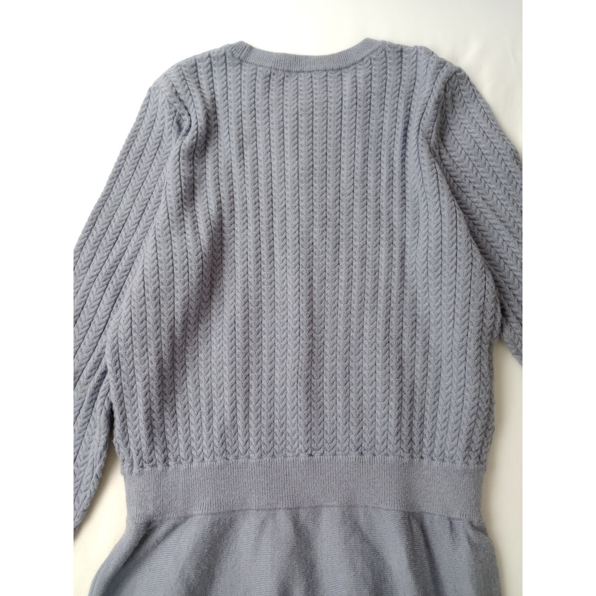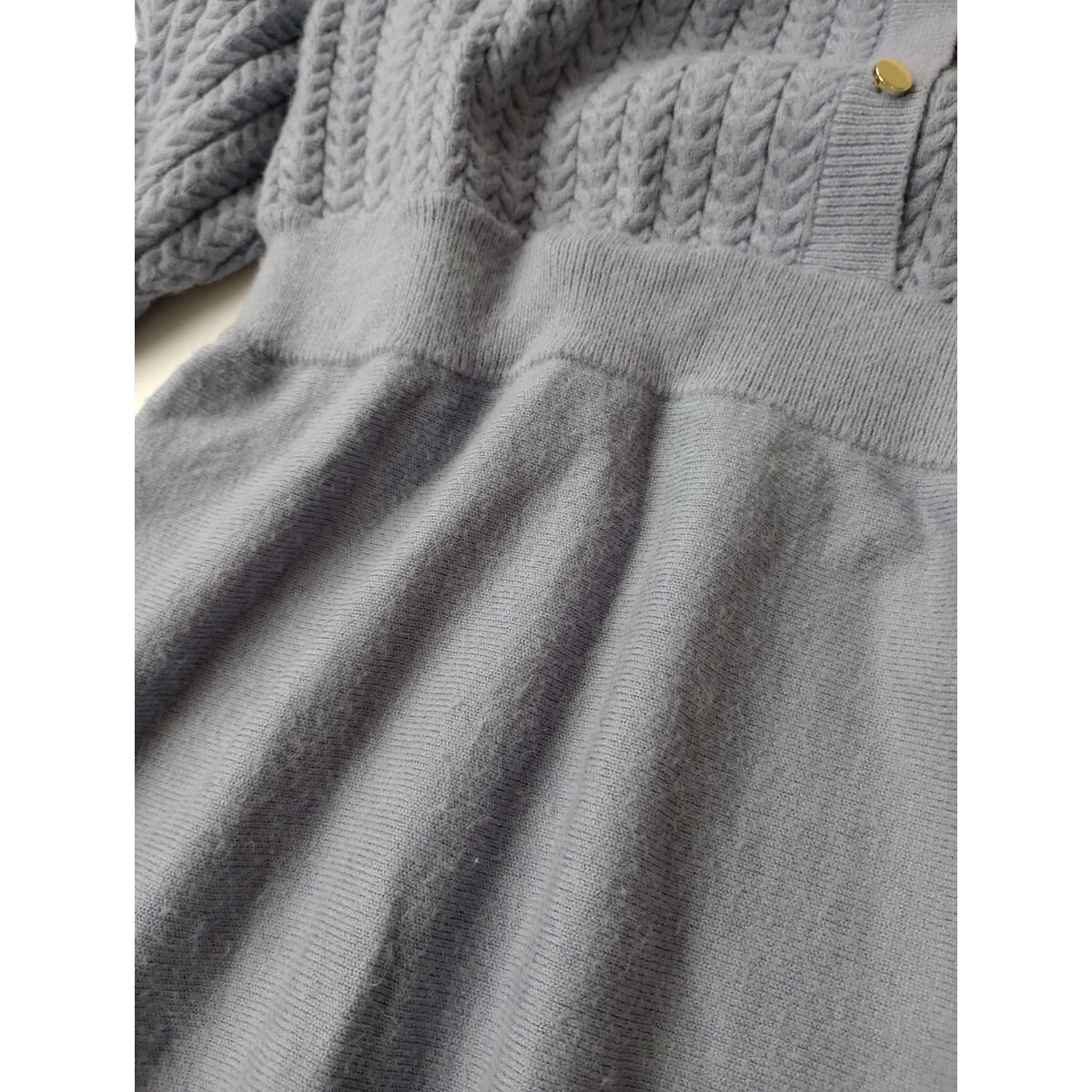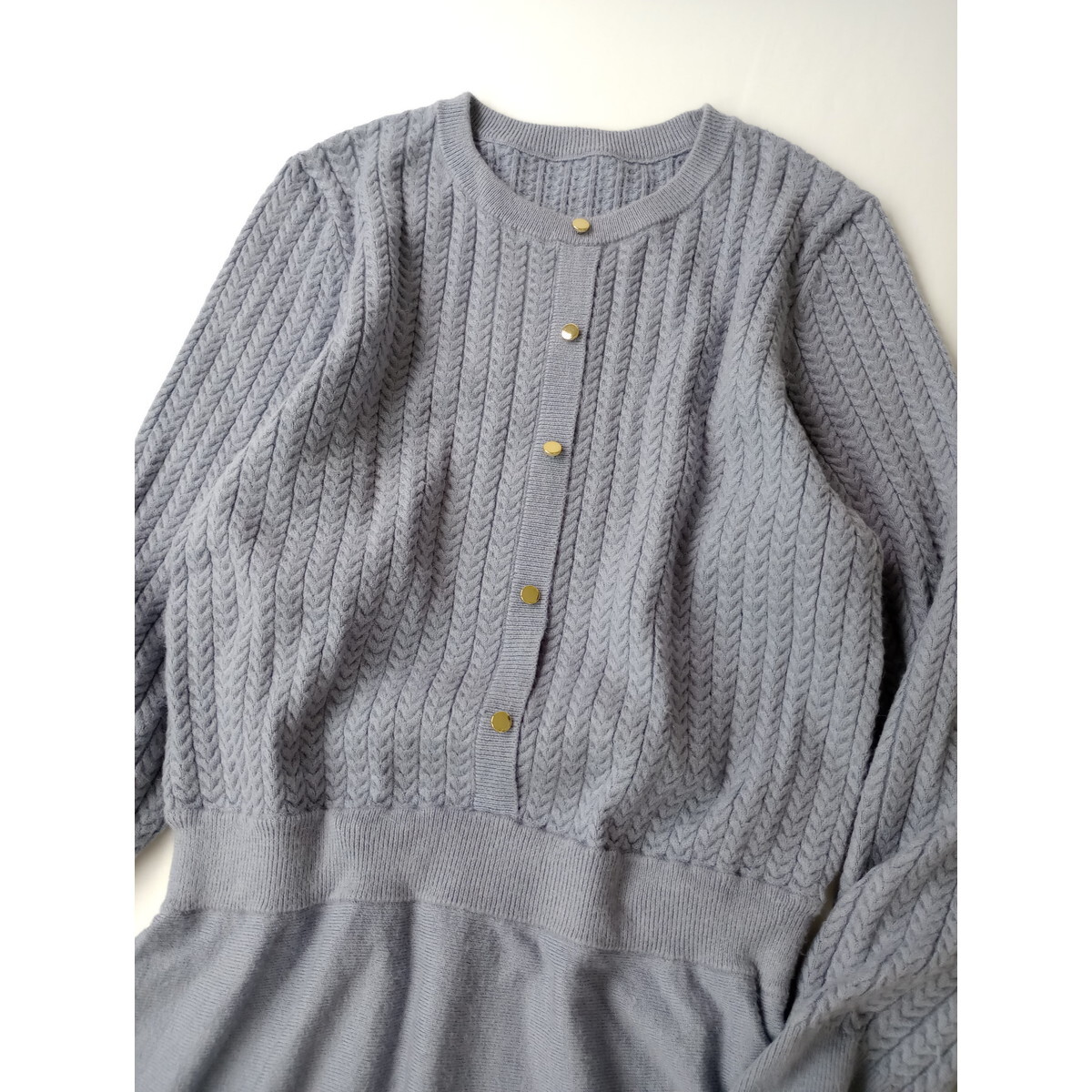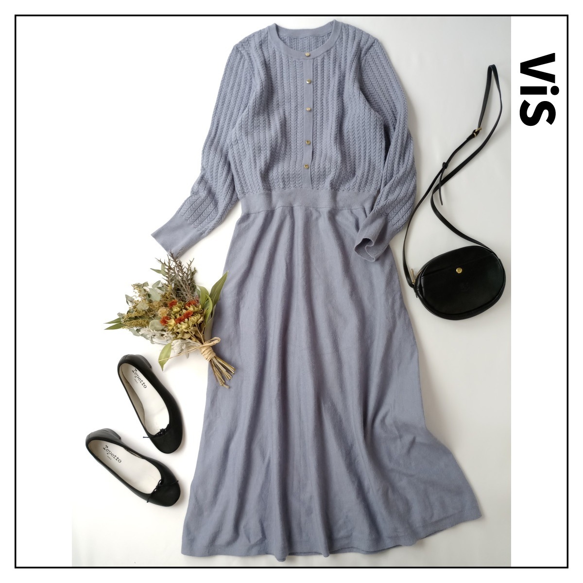 ViS ビス「ひとさじの甘さがきいた大人色♪」ミニケーブル編み ニット ロングワンピース フレア 長袖 ゴールドボタン ブルー系(5M+4488)☆