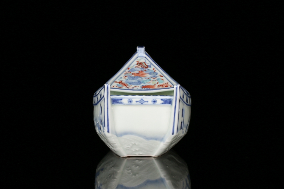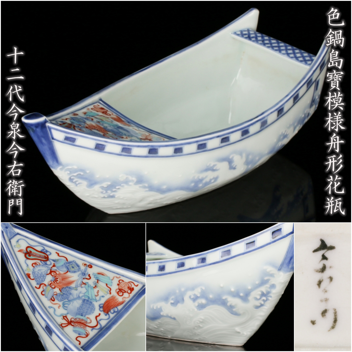 十二代今泉今右衛門『色鍋島寶模様舟形花瓶』希少秀逸作 本物保証 送料無料【松森美術】