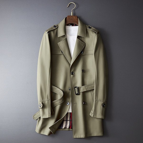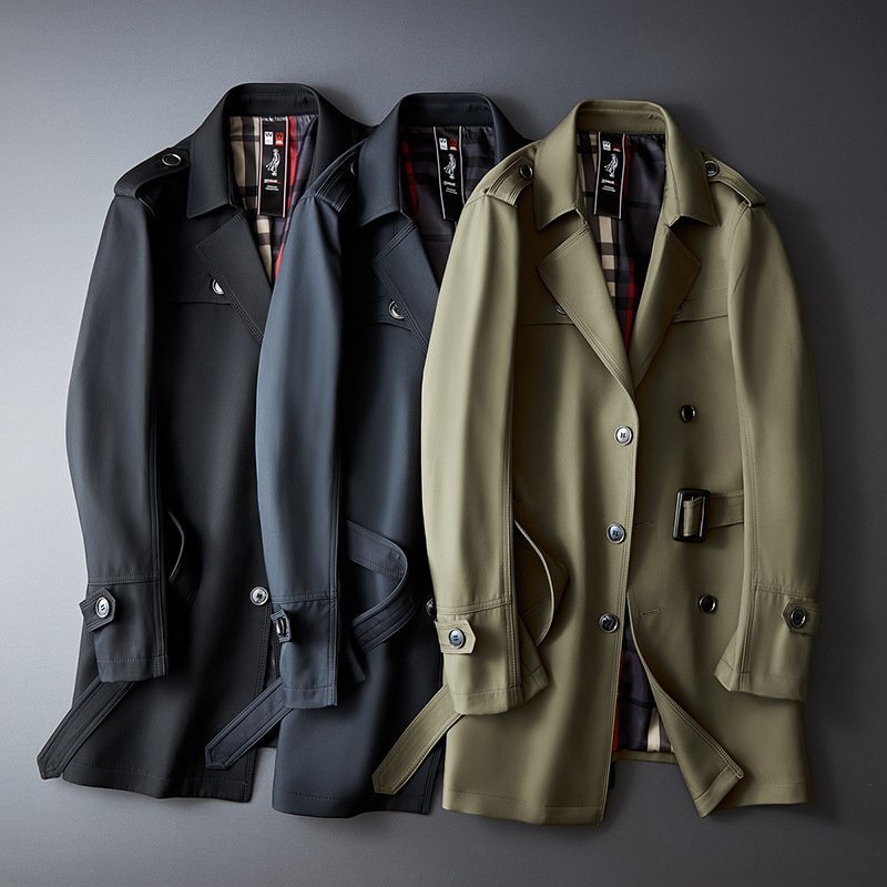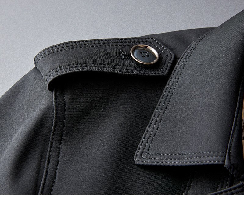 トレンチコートメンズ ミドル丈 80cm Pコート ダブル ベルト ビジネス フォーマル ミリタリー チェック裏地 ブラック 通勤 紳士服 春秋