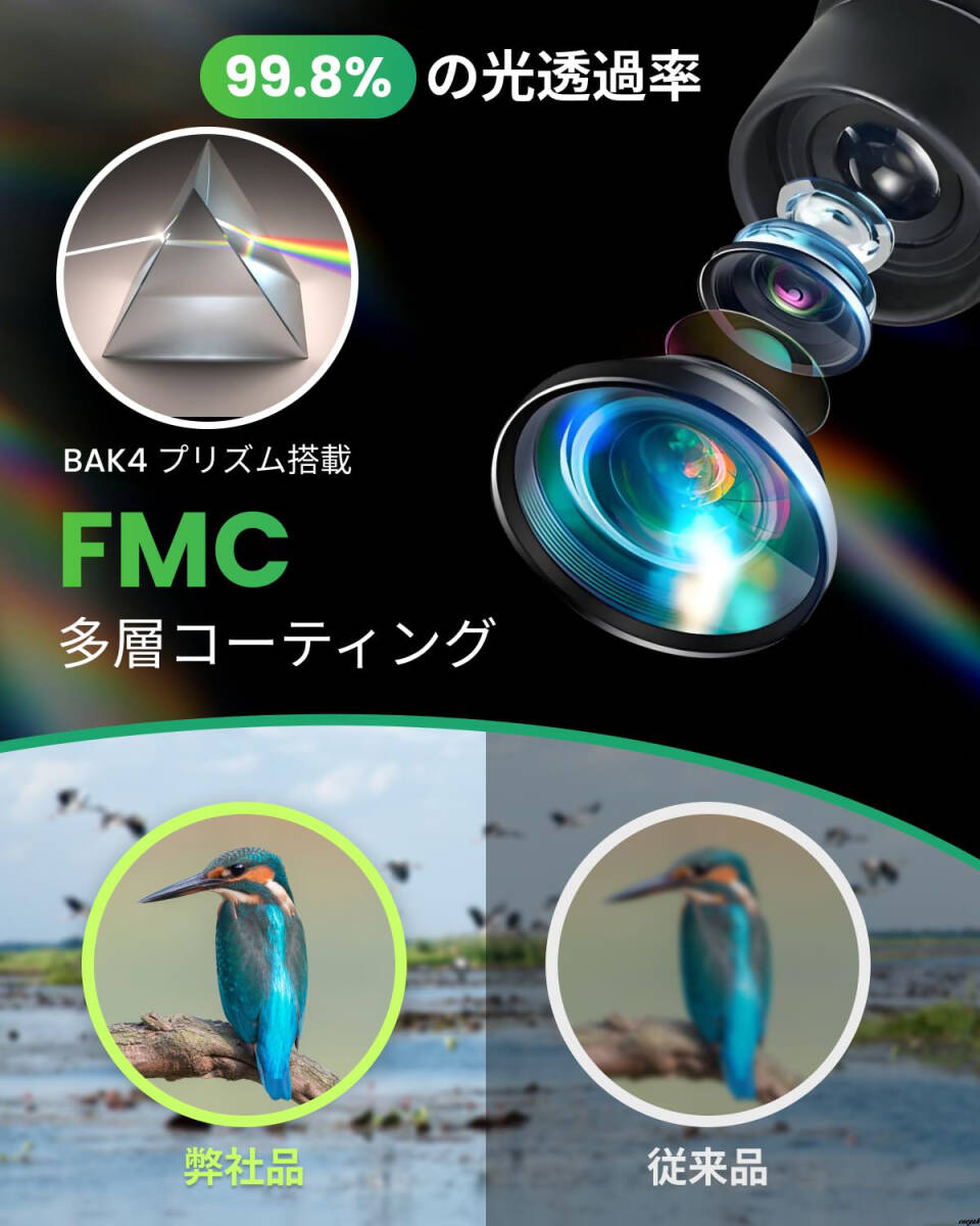 BAK4プリズムとFMCコーティングを採用し、光透過率99.8%を実現。500m先の対象も裸眼10m先のように鮮明に捉えます。