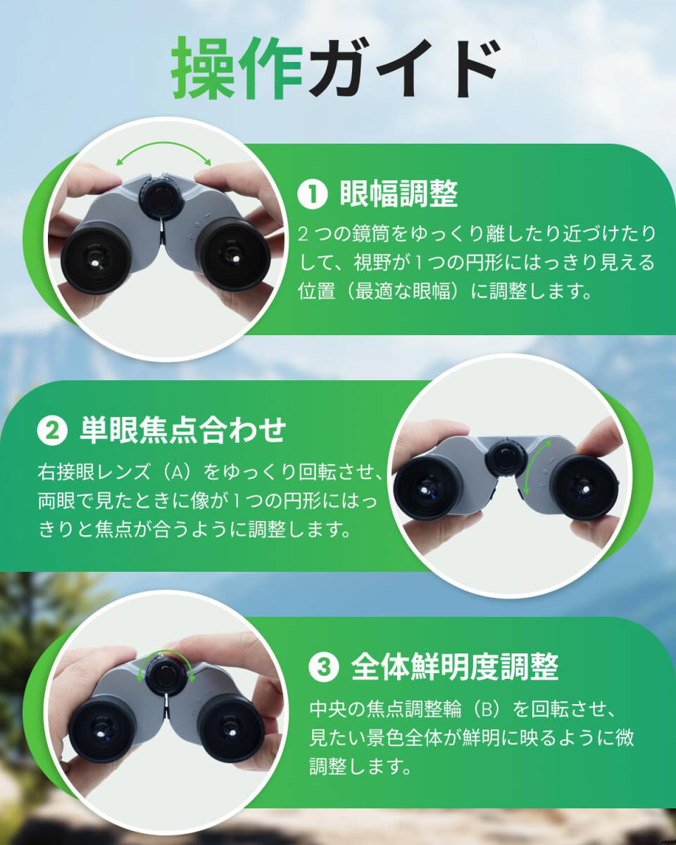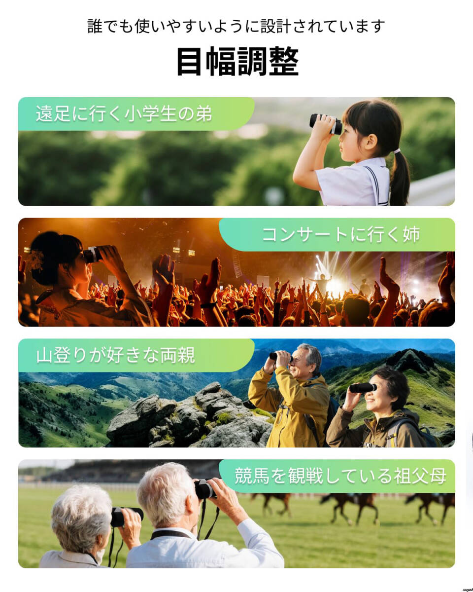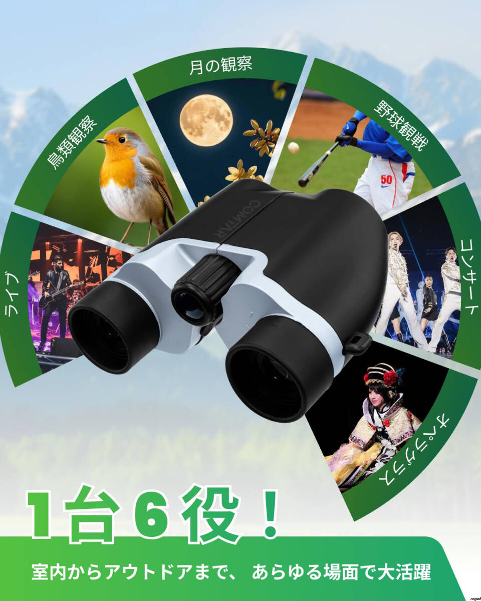 使用シーン:コンサート、スポーツ観戦、観劇、野鳥観察、登山、旅行、アウトドア