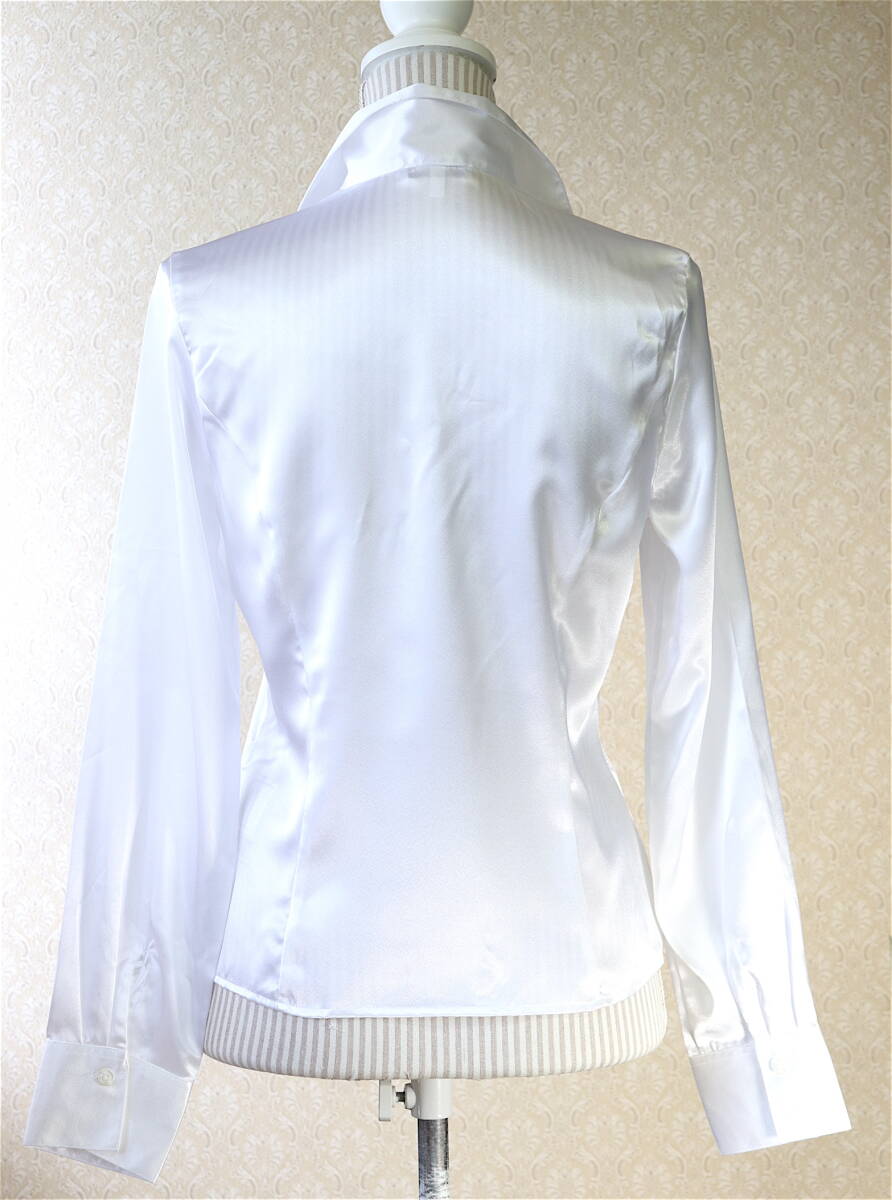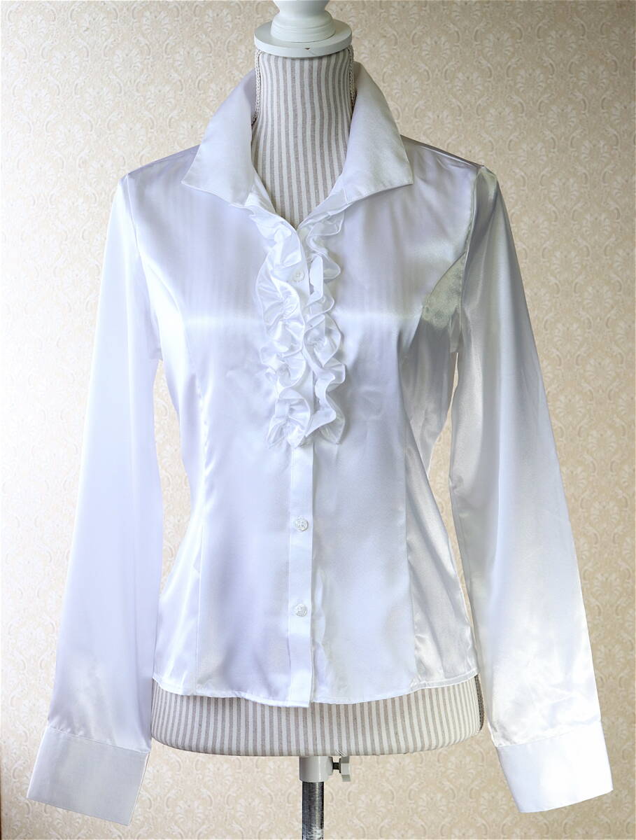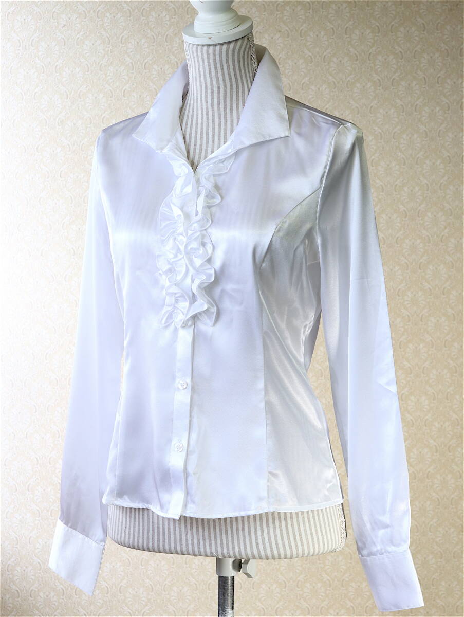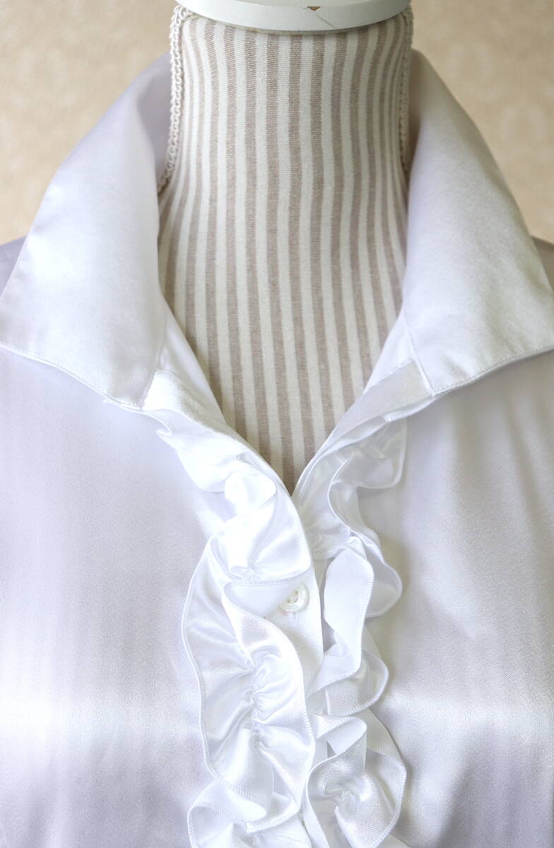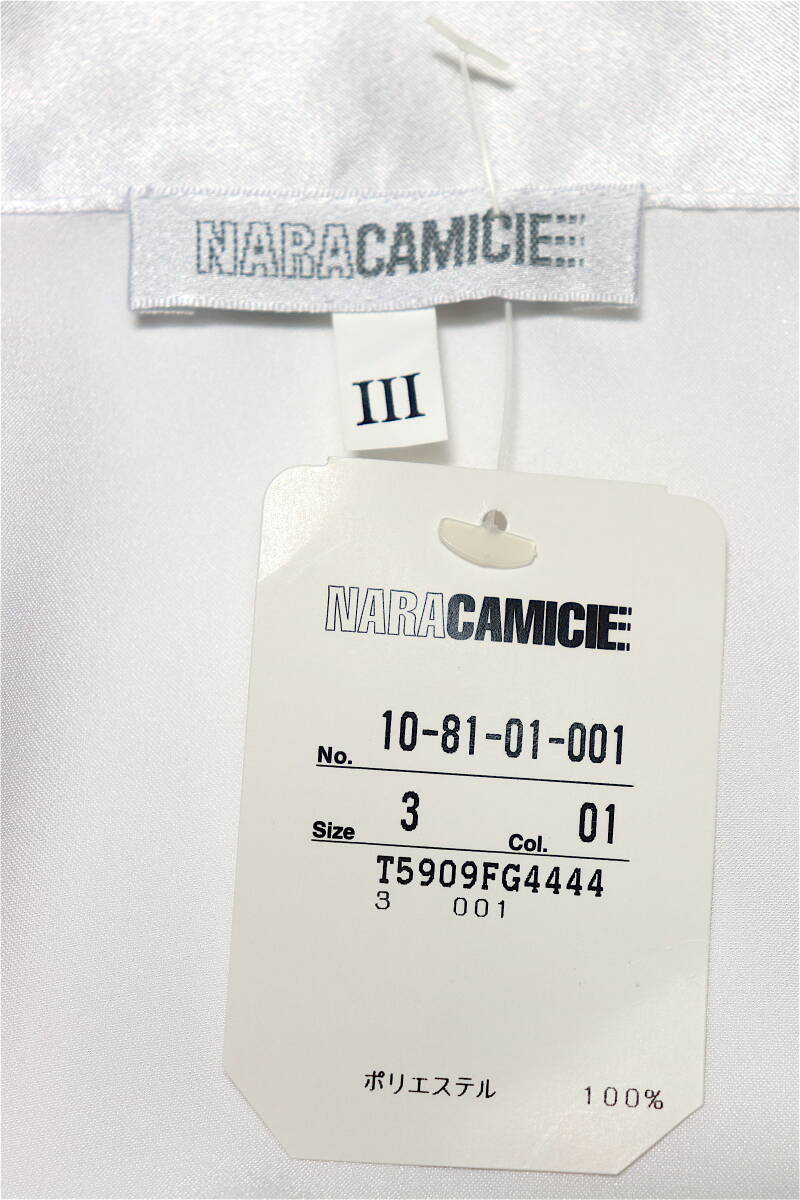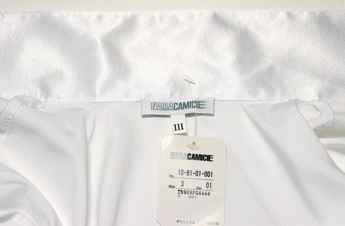 【タグ付未使用】L【やや難あり】ナラカミーチェ 白 ポリエステルサテン 長袖 前立フリル ブラウス シャツ 新品 美品【クリックポスト】