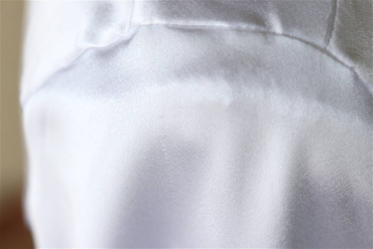 上品な光沢のある白のポリエステルサテン。オフホワイトでも蛍光白色でもない、普通の白。