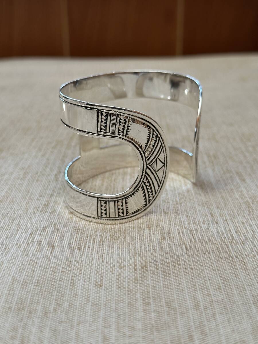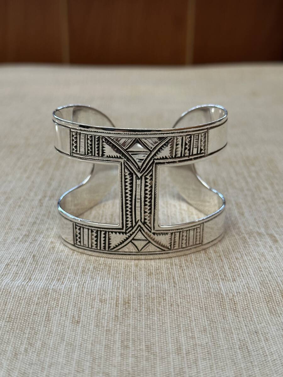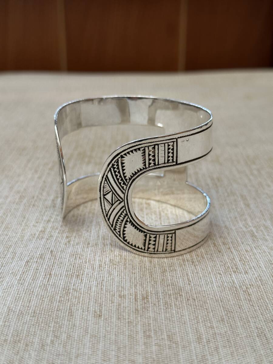 エルメスの頭文字Hをデザインしたバングルの正面と両エンドに、青い衣の民として知られるトゥアレグ族が伝統的な模様を一つ一つ手彫りしています。