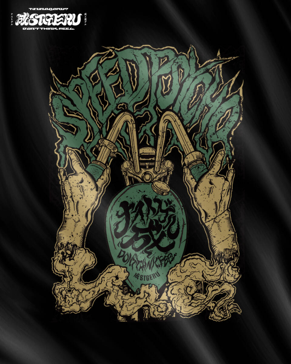 2025年 8/31(日)に「メカマニ・ギアギャラリー」2025 に初出店させていただくにあたり、同時開催の「NEWORDER CHOPPER SHOW」のために描きおろしたグラフィックTシャツ「SPEED PSYCHO」10枚限定で製作しました。