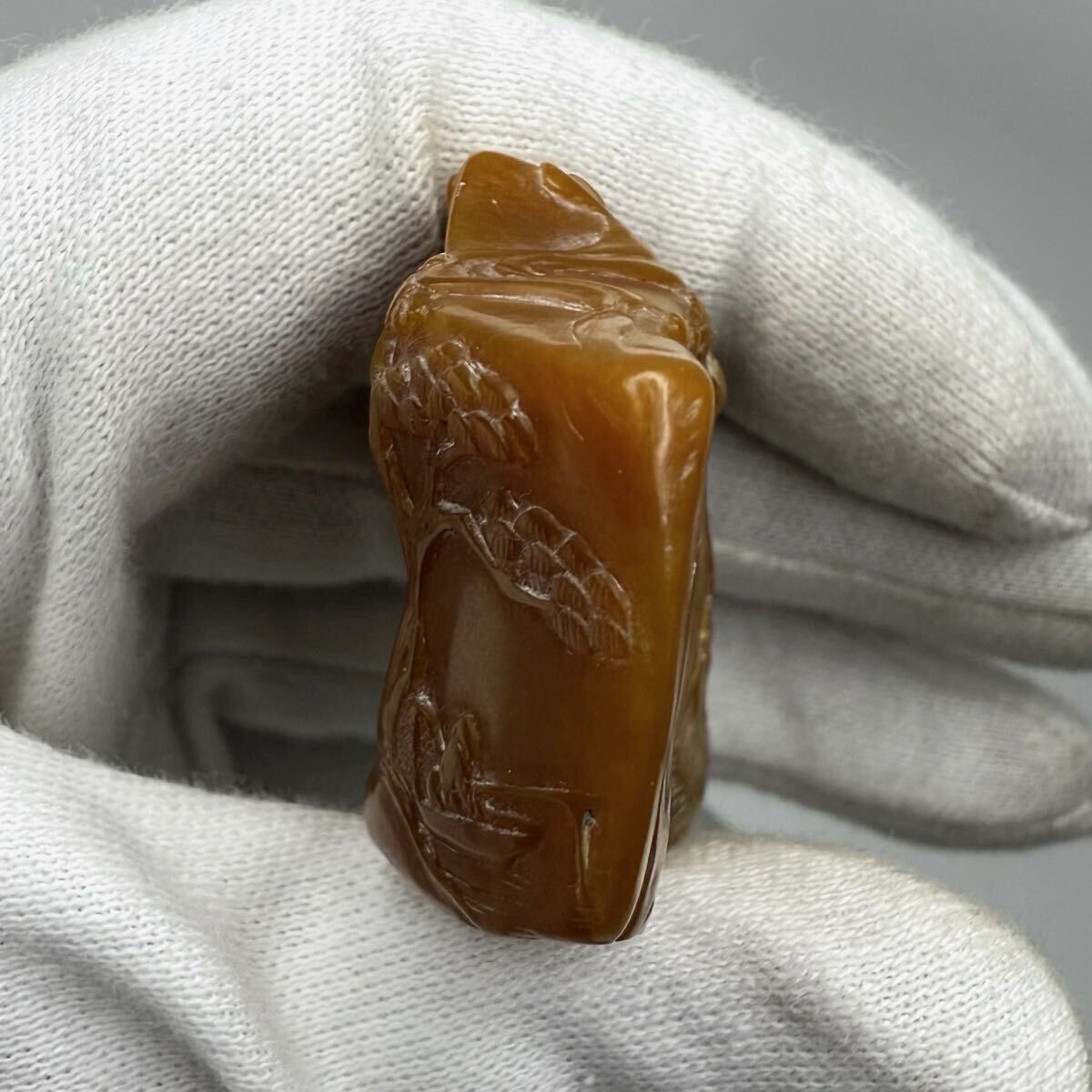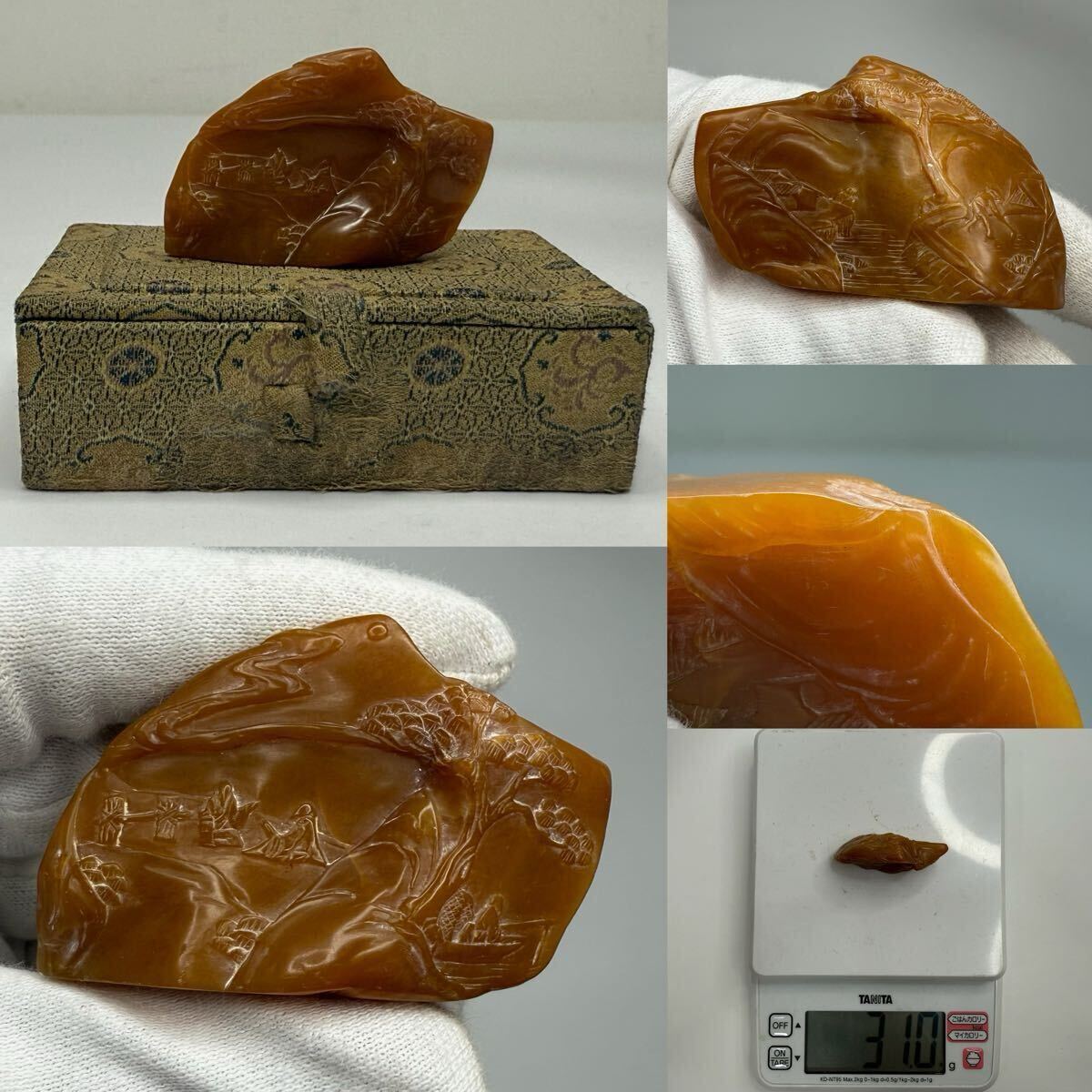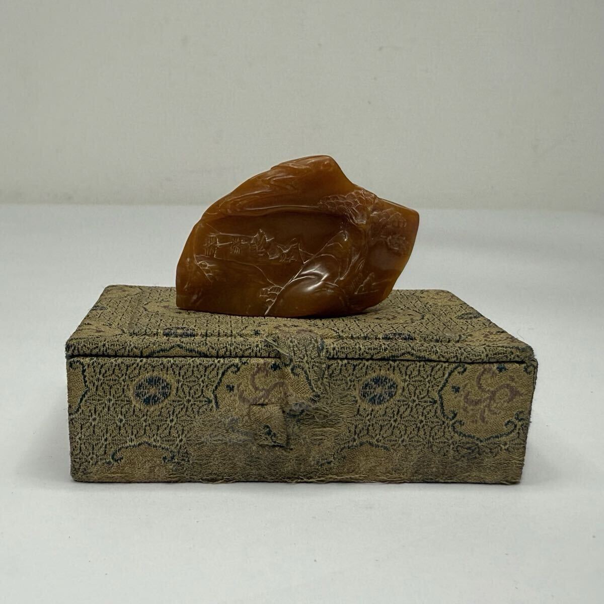 | 中国古美術 時代物 篆刻 寿山石 田黄石 彫刻 山水図 書道 印材 印章 印鑑 文房具 共箱付 唐物 中国古玩 骨董品 5.2×1.5×3.3cm 重さ31g |
