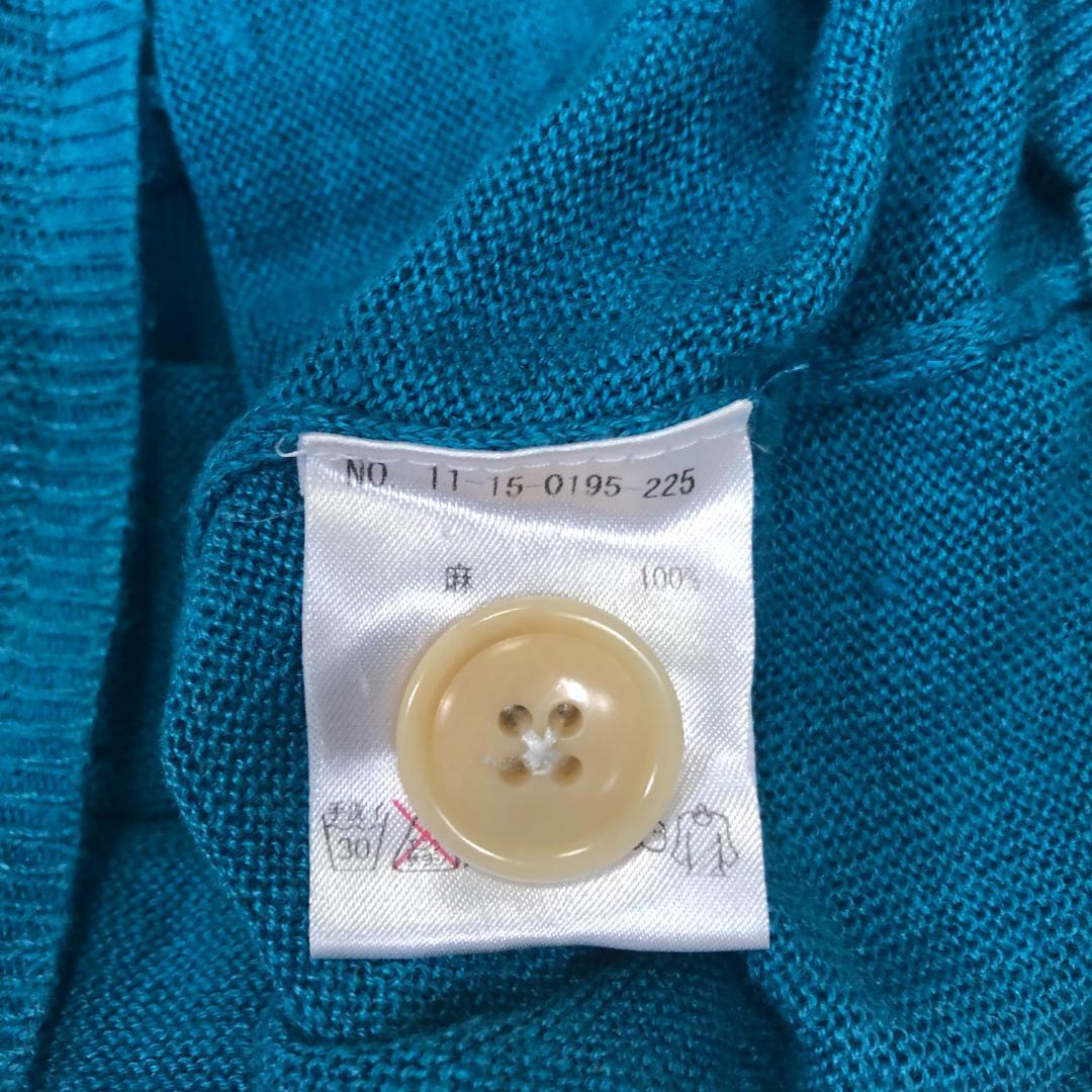 麻100%、ターコイズ色のカーディガン、ボタン開閉、ポケット付きです。朝晩の寒暖差が激しい季節に活躍します。