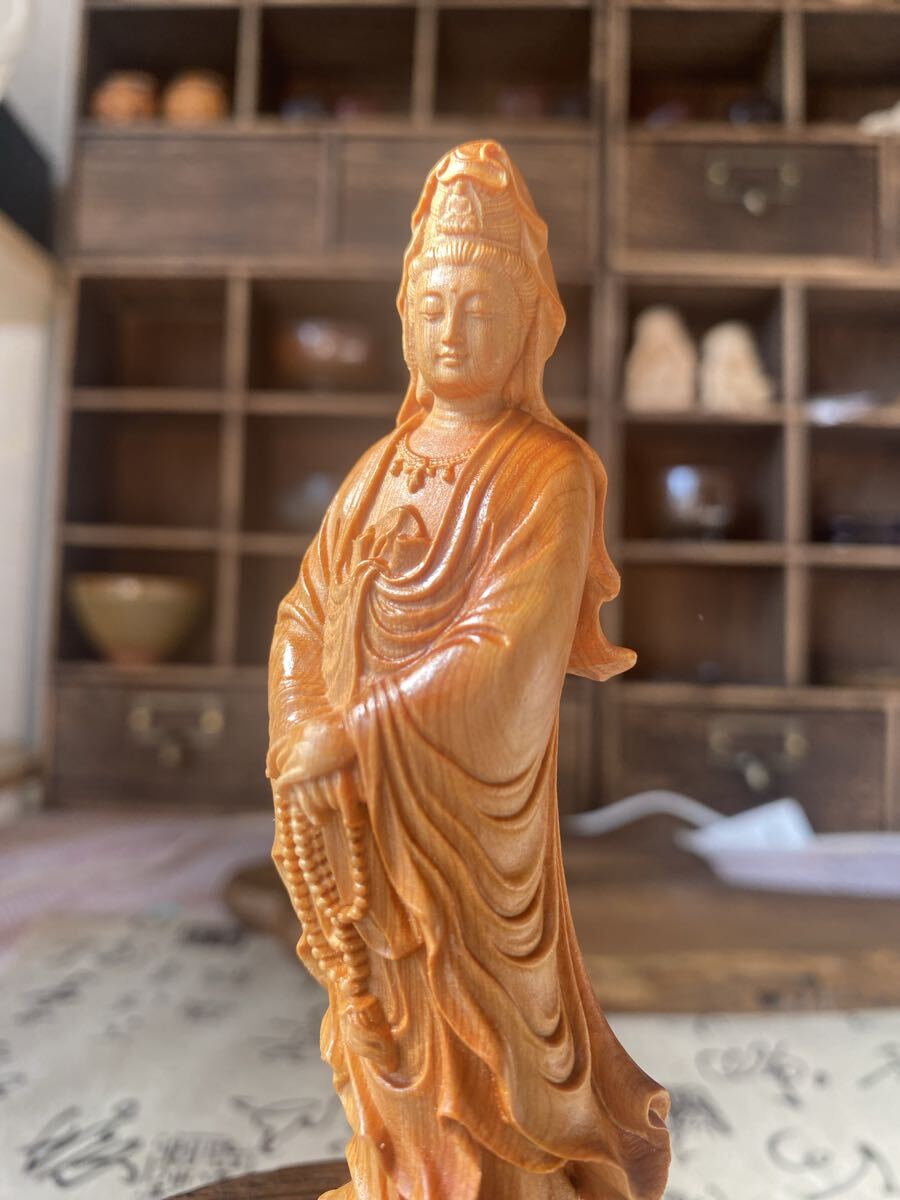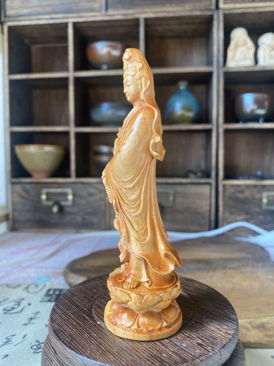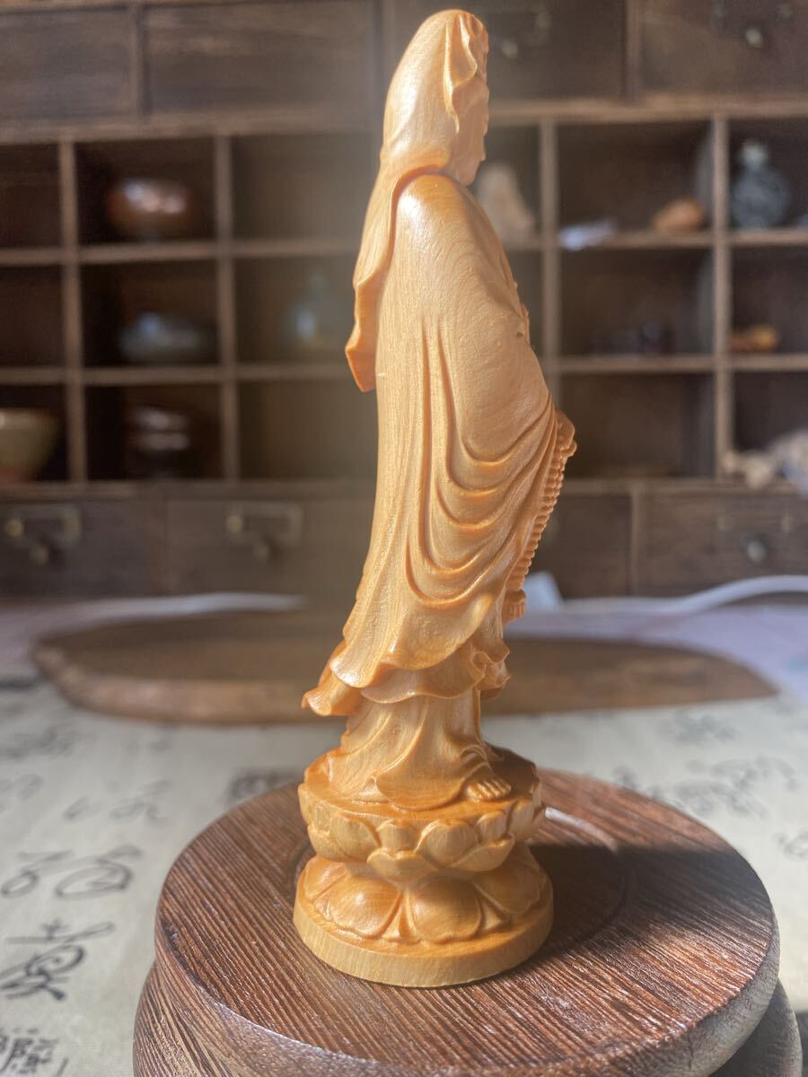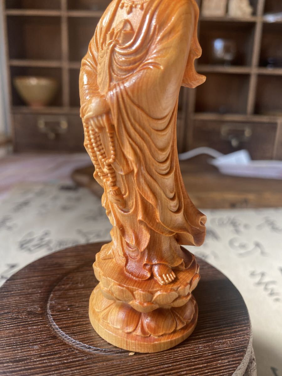 送料無料 観音菩薩 細密木彫 繊細彫刻 立像 天然木材 観世音菩薩 観音様 お守り 仏教美術 ご本尊 縁起物高さ12cm 綺麗な木目