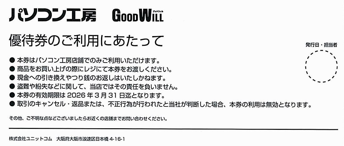 有効期限は「2026年3月31日」です。 本券は、パソコン工房店舗でのみご利用いただけます。 |