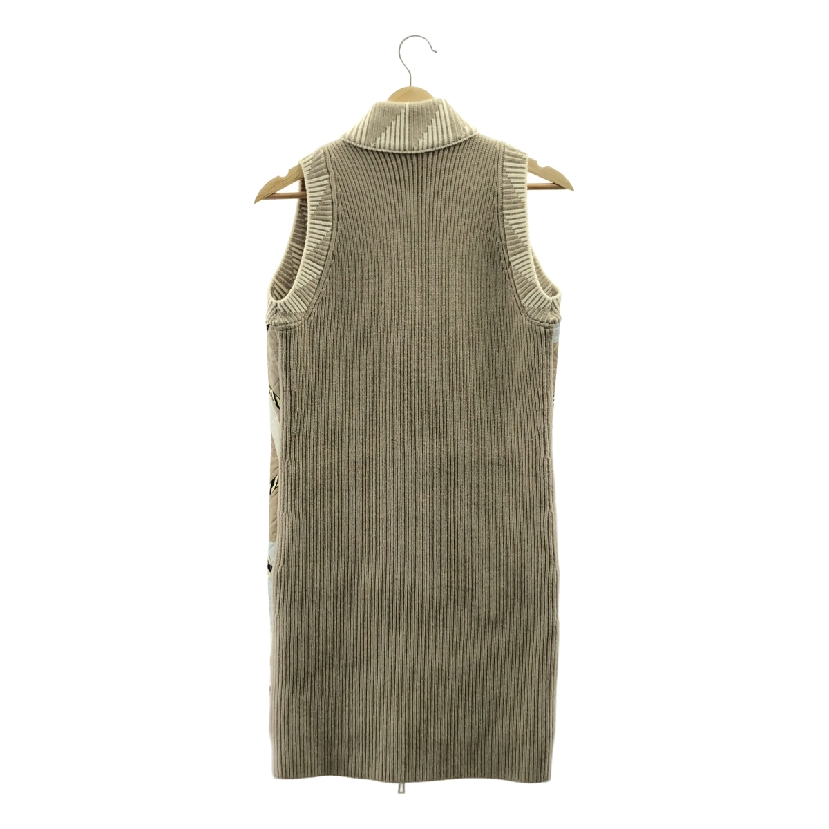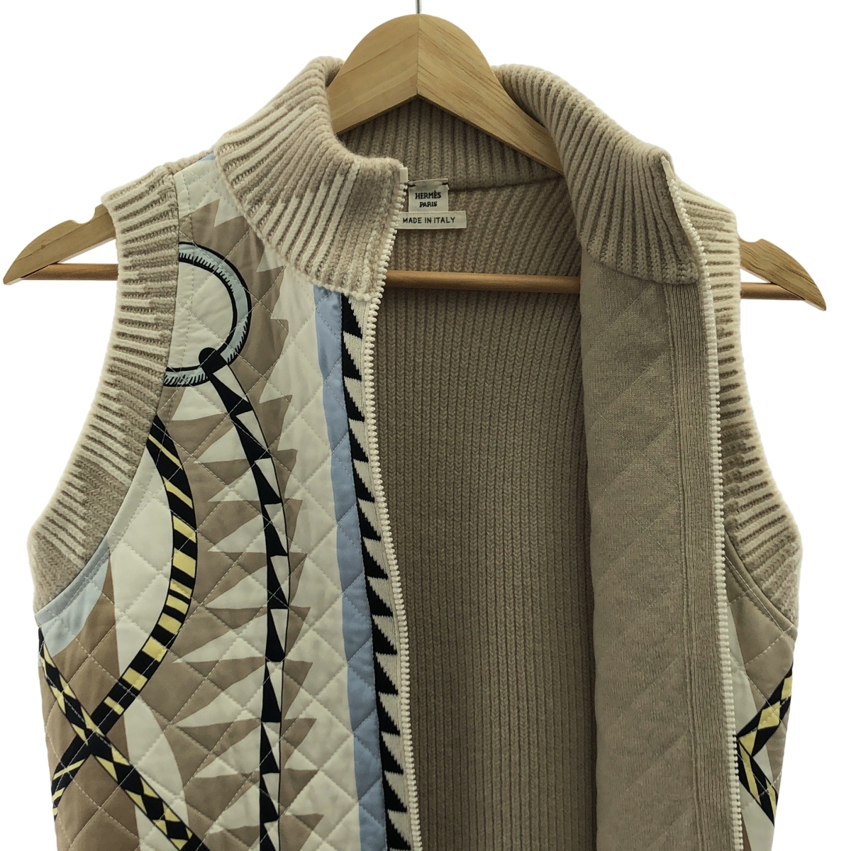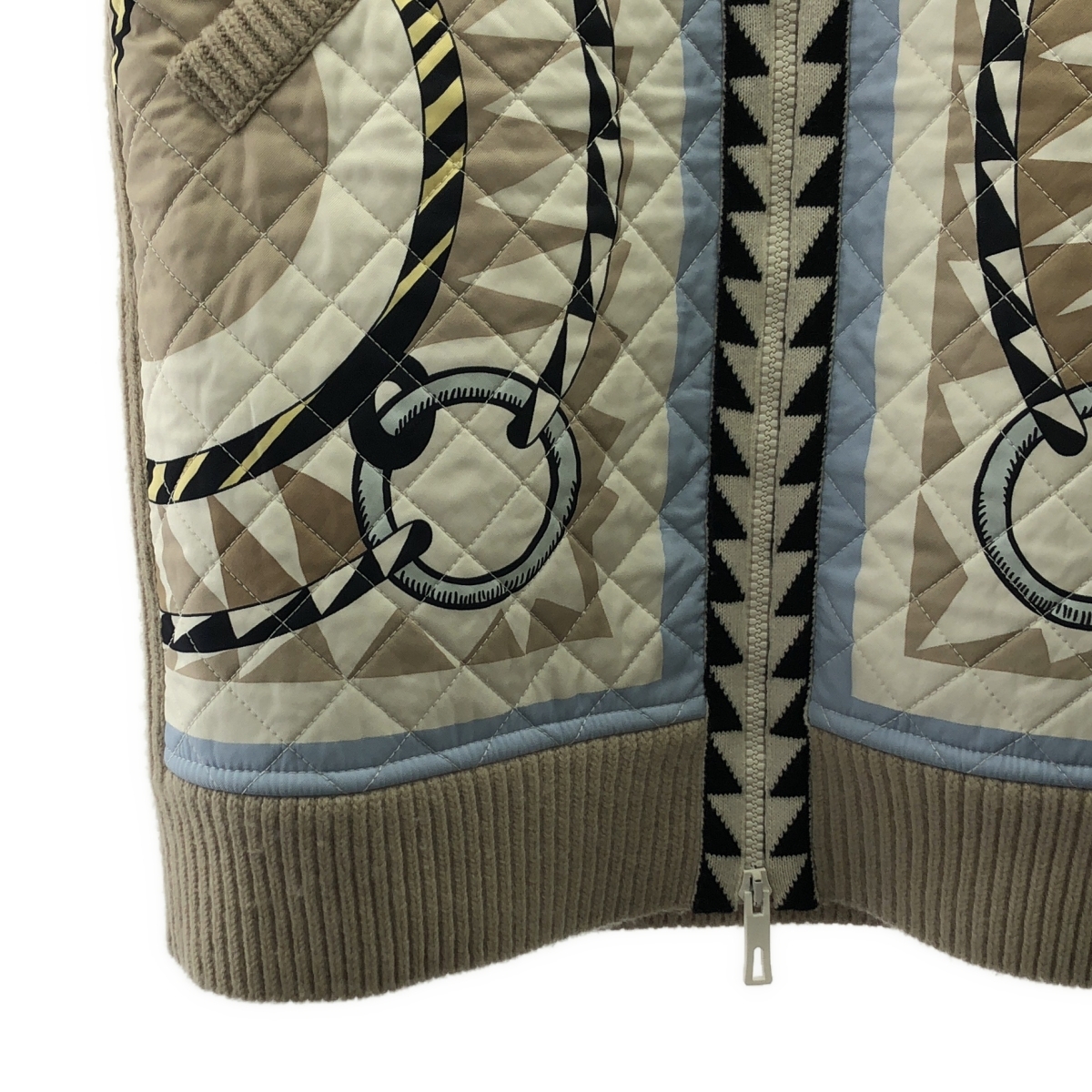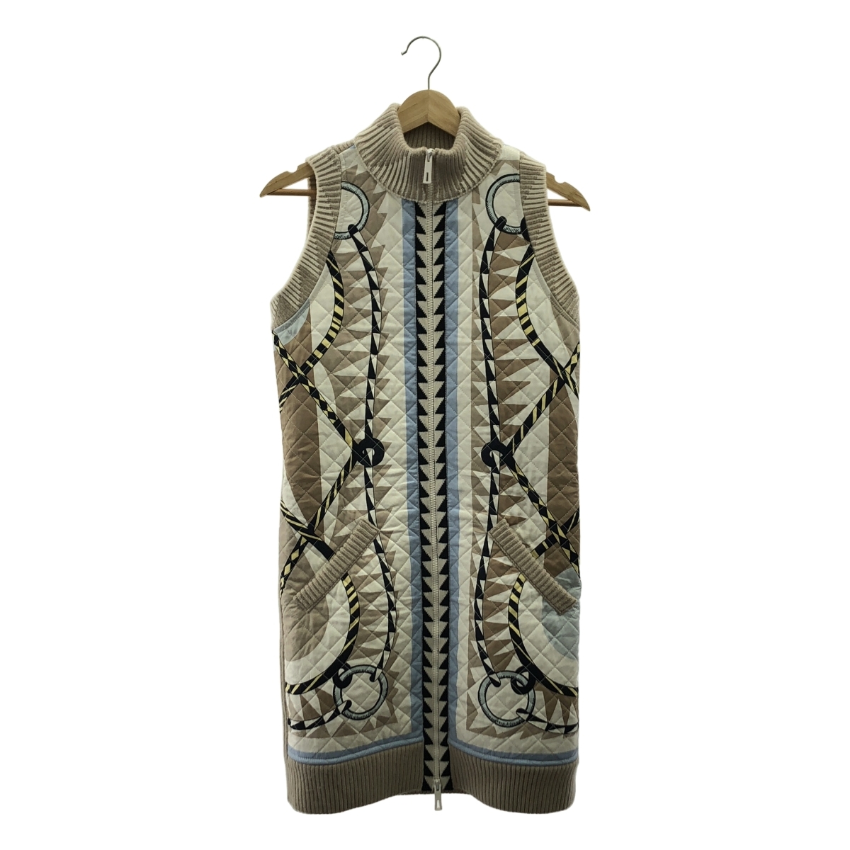 HERMES / エルメス ツイルレーヌ スカーフプリント ニット切替キルティングロングダウンベスト