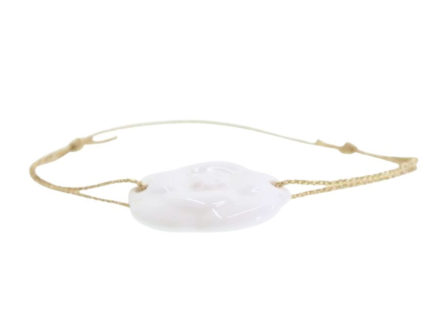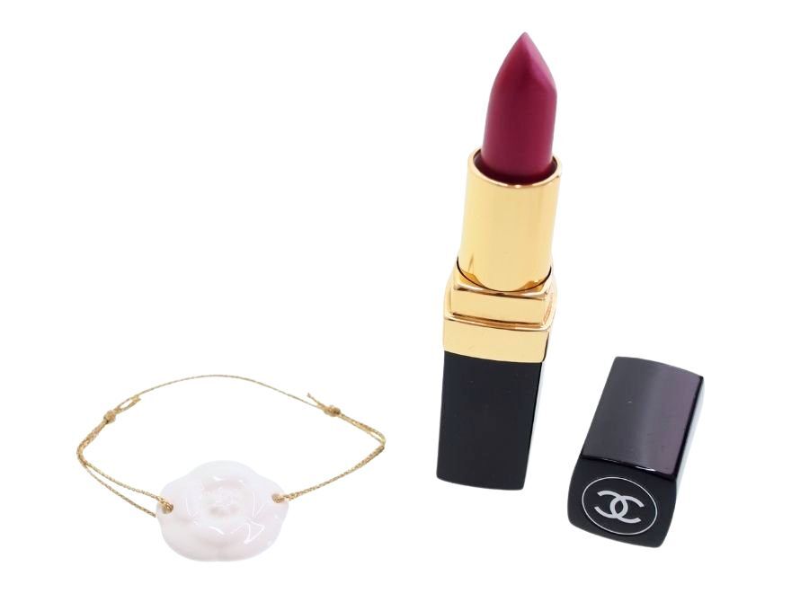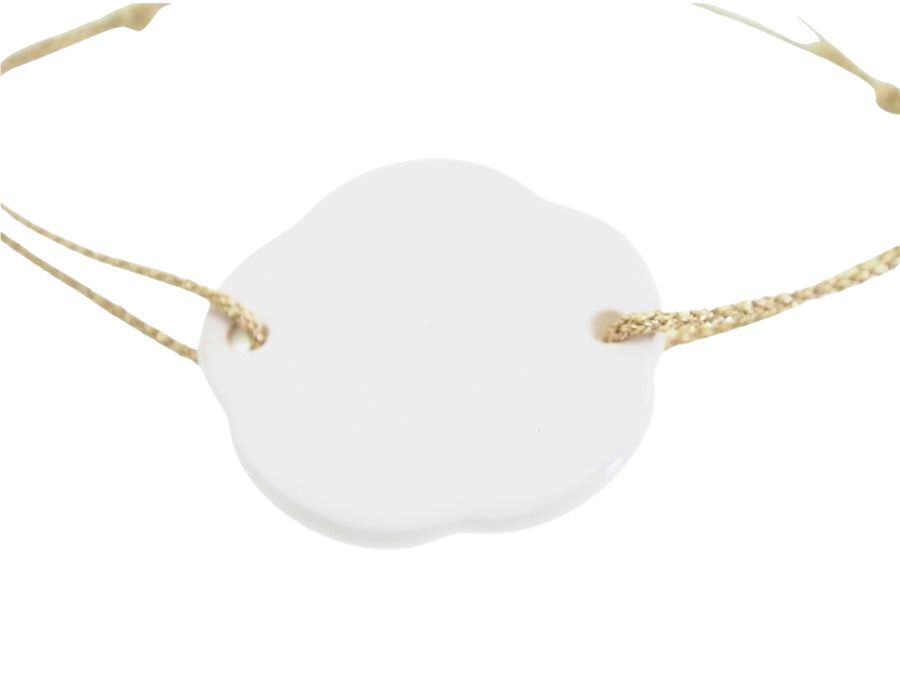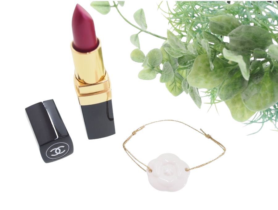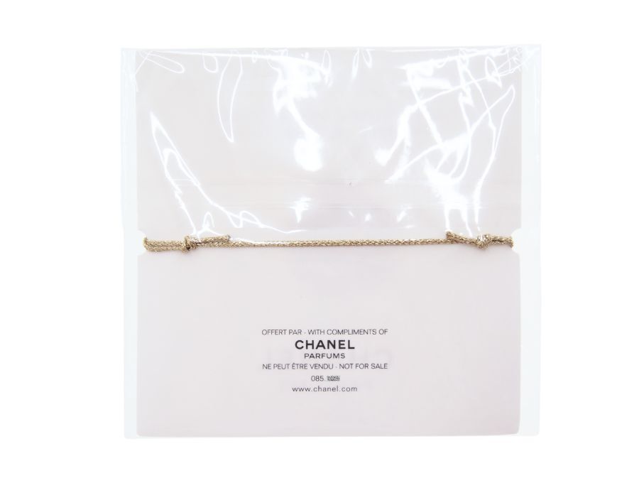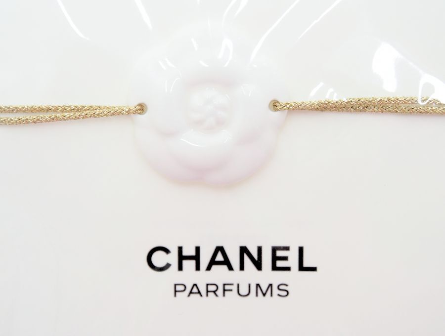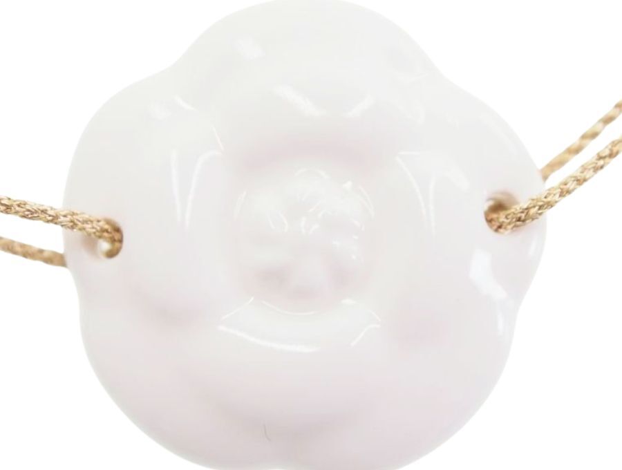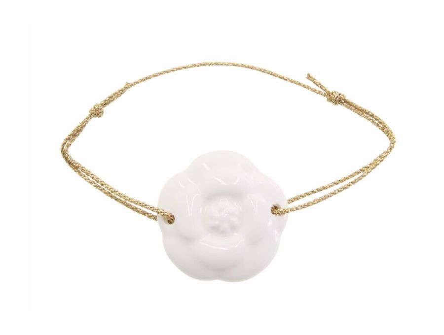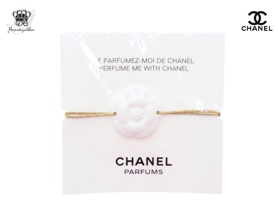 シャネルパフューム「PERFUME ME WITH CHANEL」のノベルティブレスレットです。陶器製の上品なホワイトカメリアがモチーフになっており素敵です。とめ結びのキラキラしたゴールド紐にそのまま腕を通してお使い頂けるフリーサイズになっているため、指輪と比べてサイズをあらかじめ知っておく必要がなく贈り物にも選びやすいアクセサリーになります。