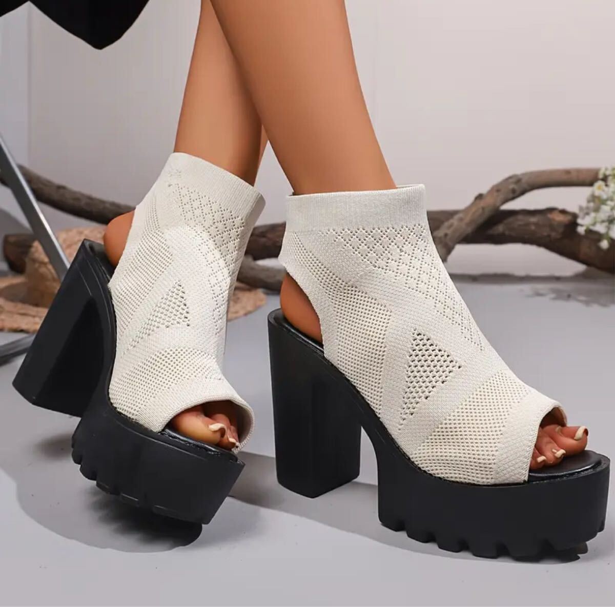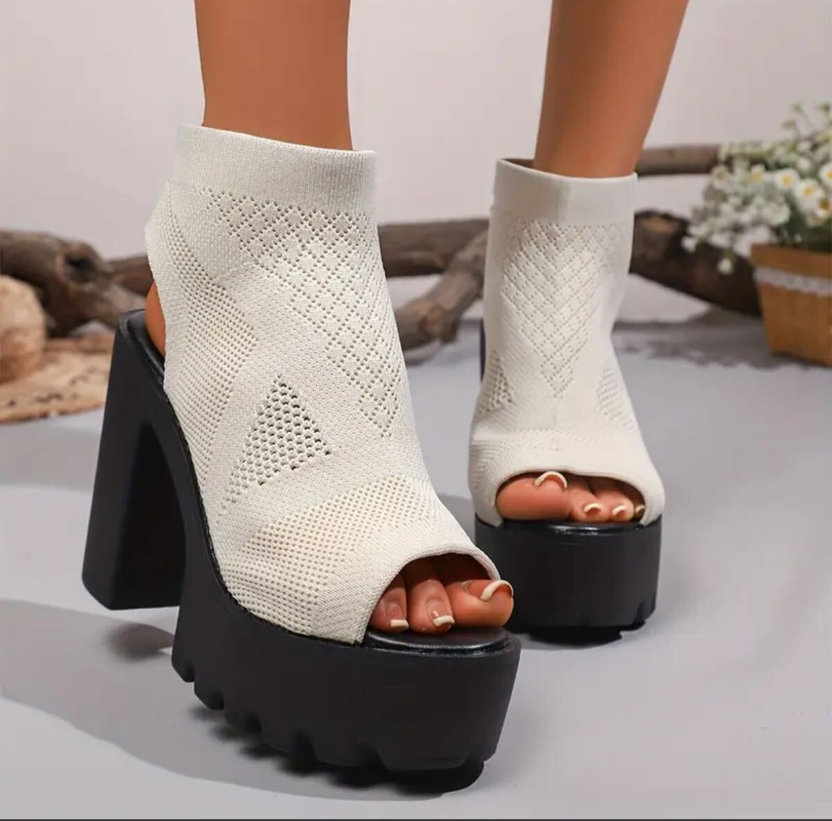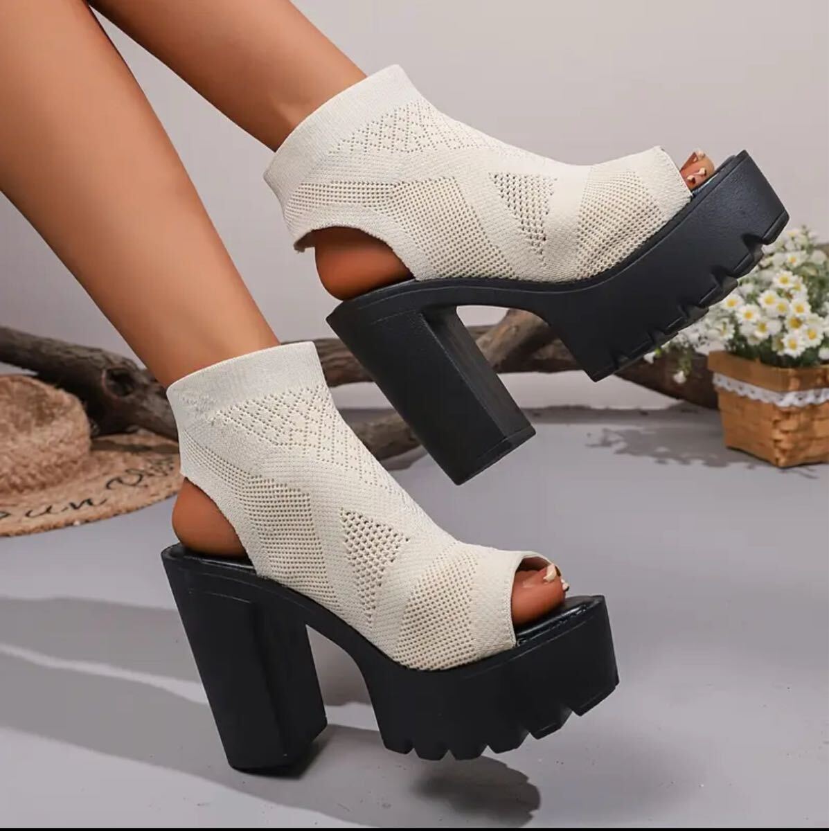 繊細なレースとニット素材を組み合わせた、大胆な厚底サンダルが登場。
