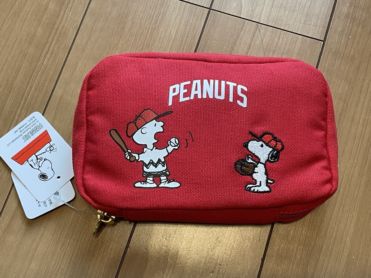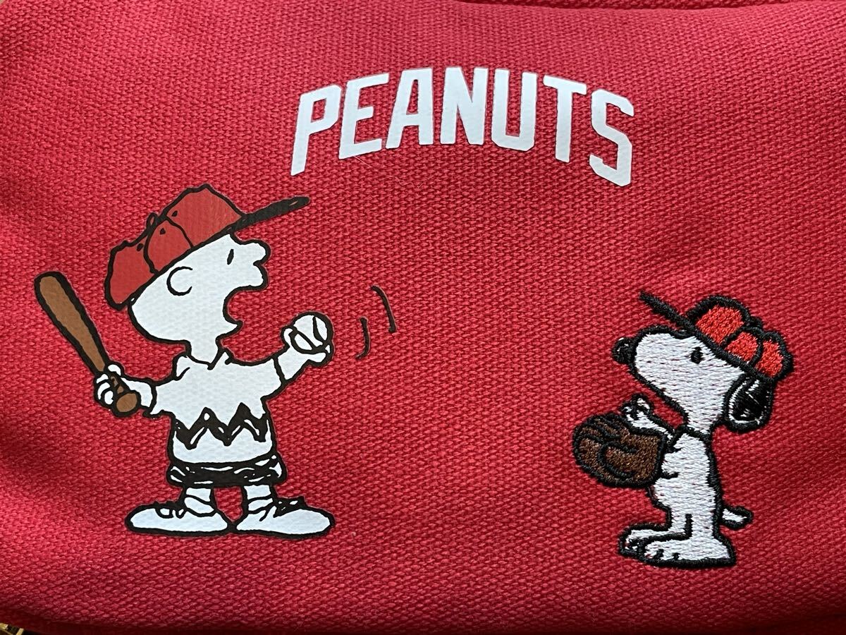 スヌーピーの刺繍、ウッドストックのチャーム、内側の総柄などとてもおしゃれなお品ですよ★