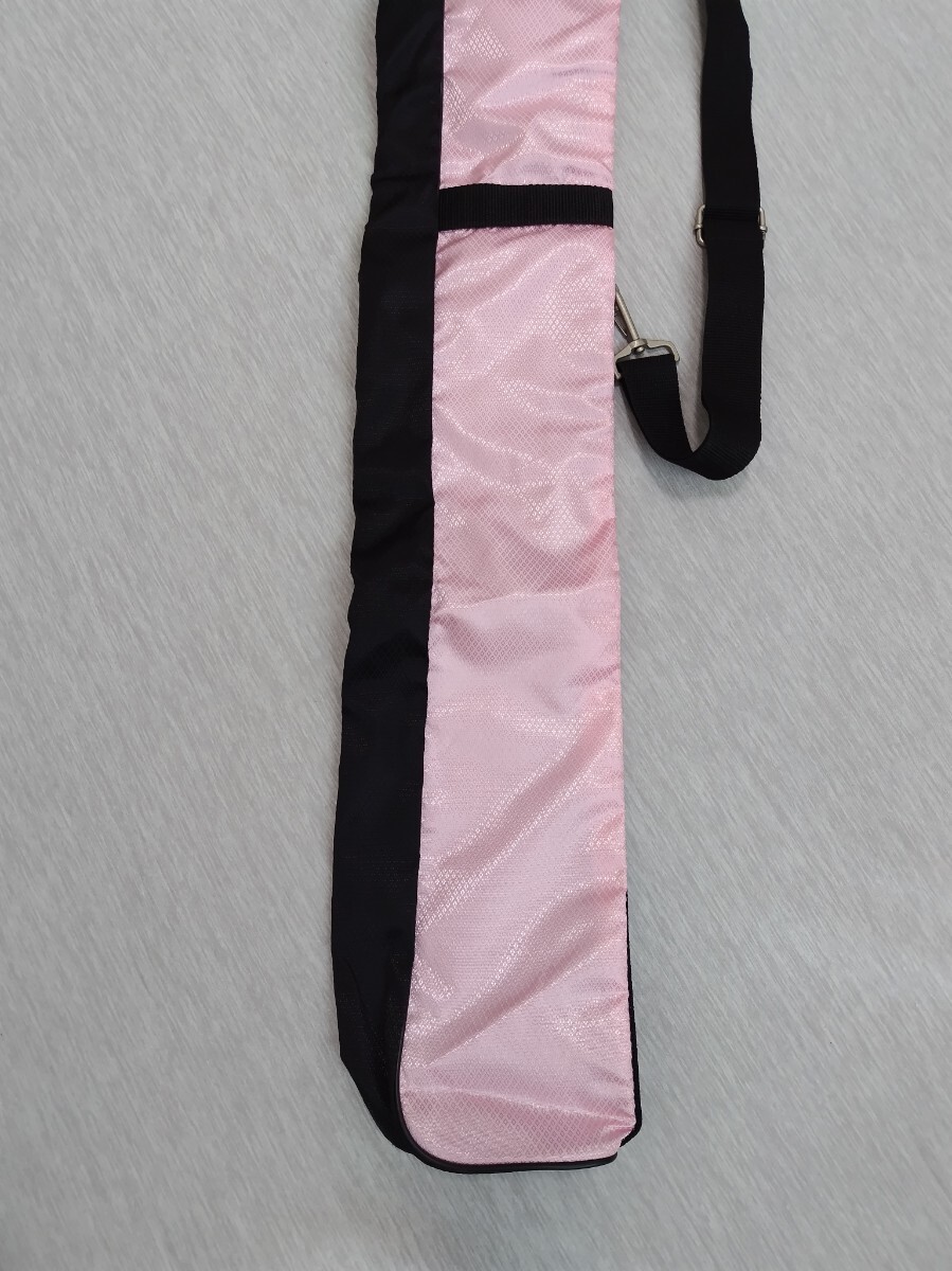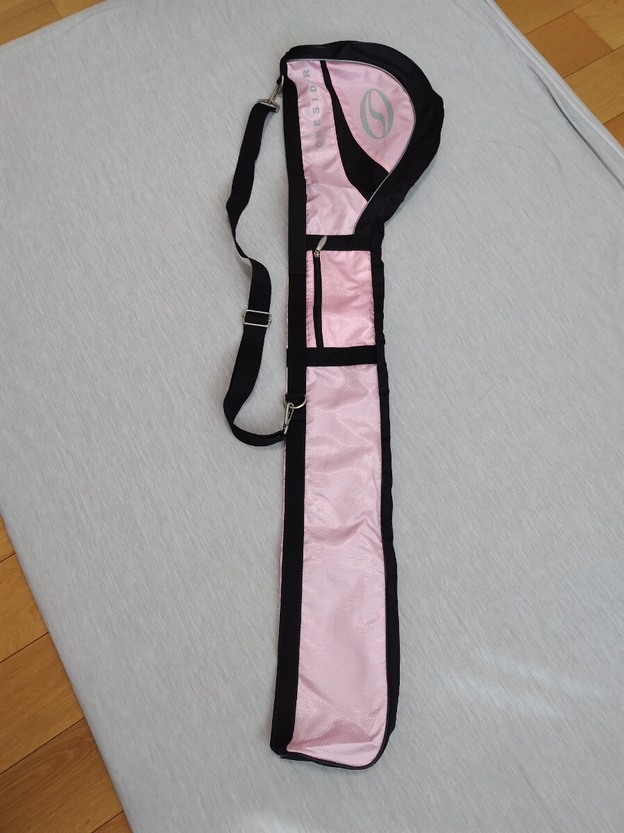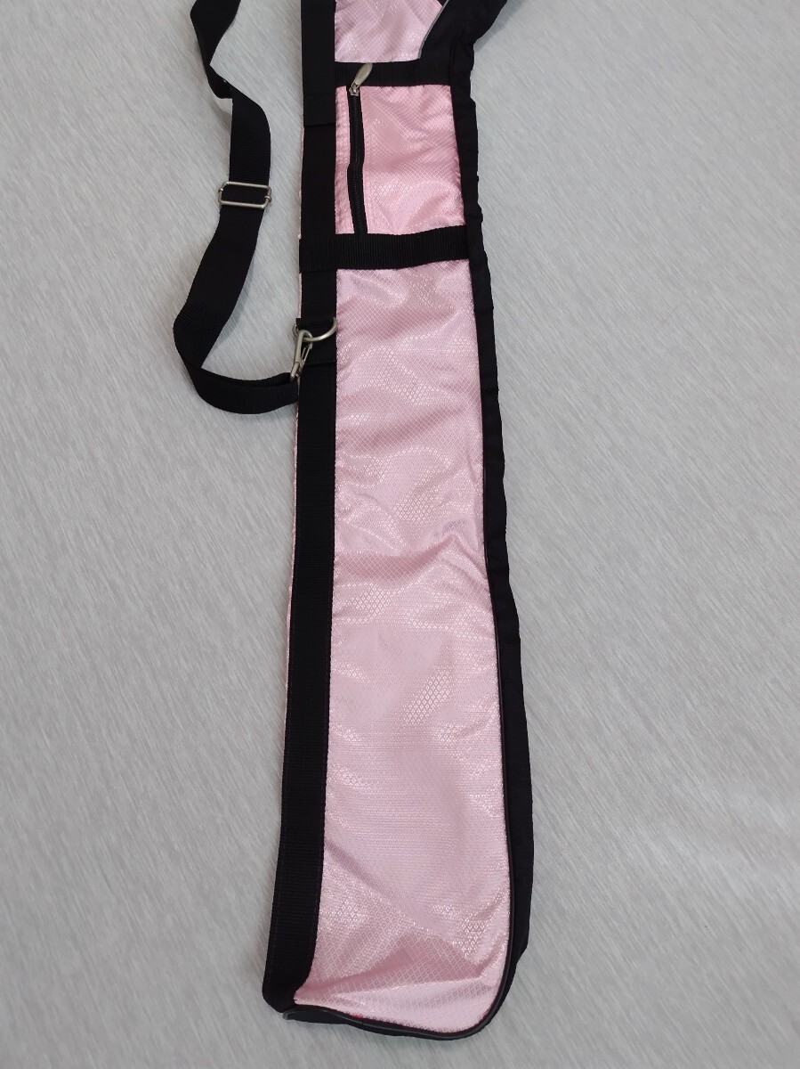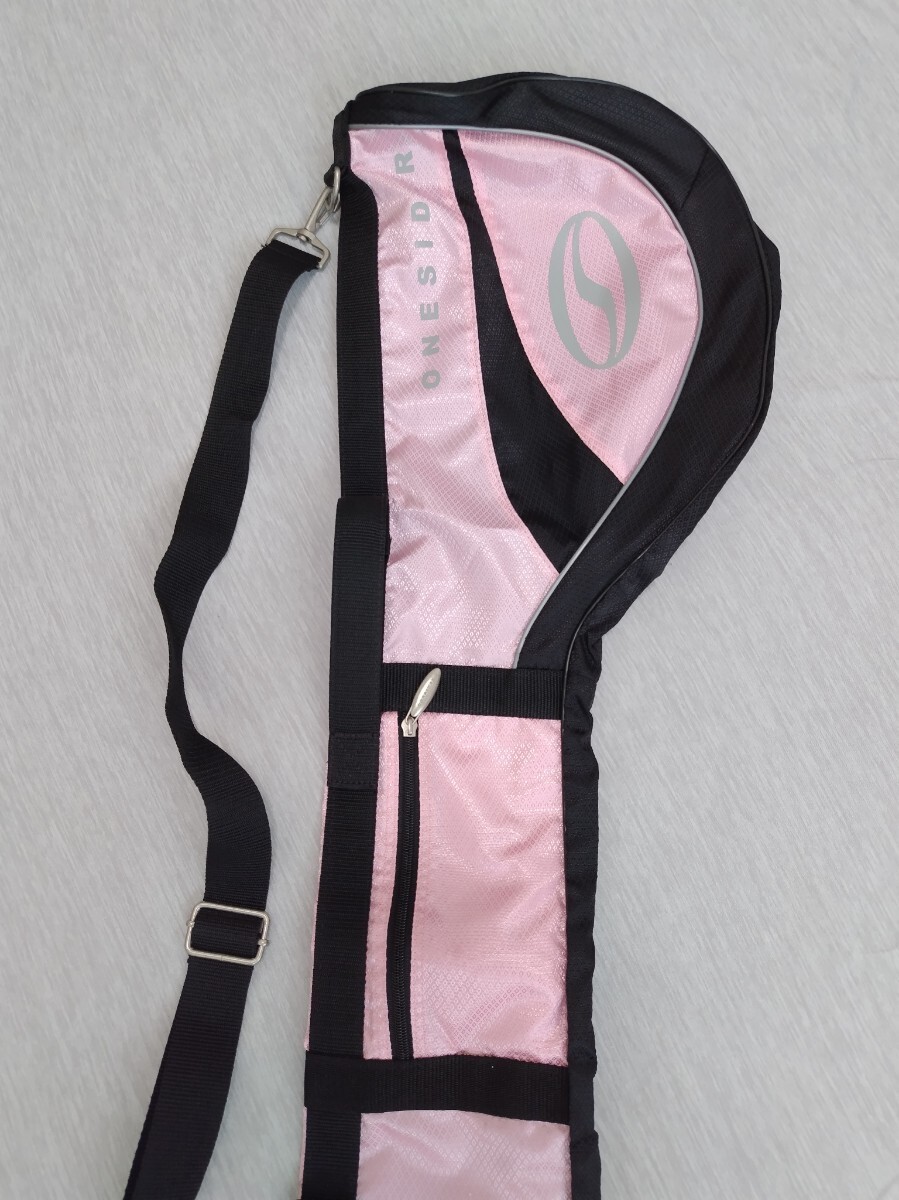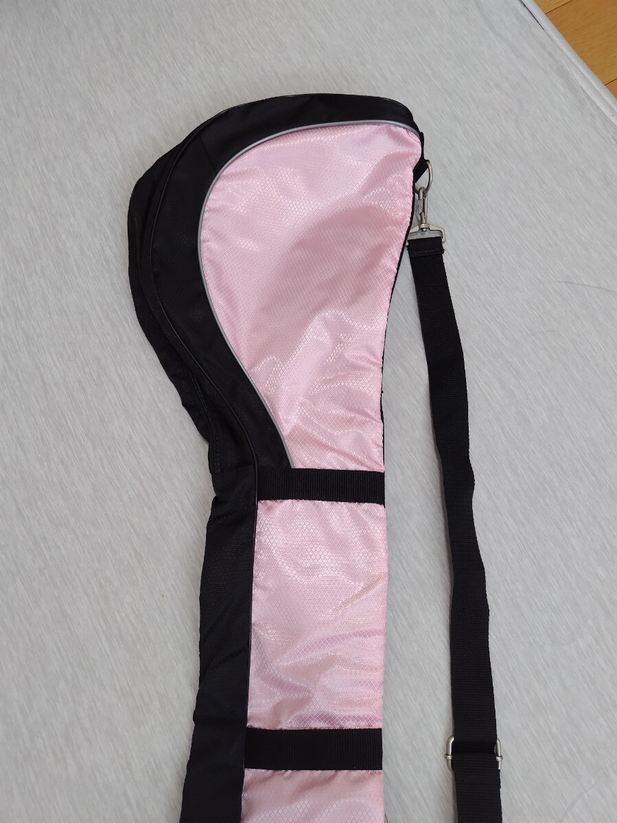 ◯ピンクと黒のスリムなゴルフバッグ、調節可能なショルダーストラップとジッパーポケット付き。