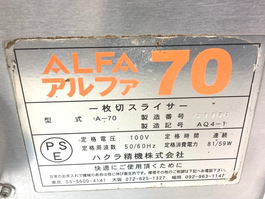 5g071 ハクラ精機 ALFA70 アルファ70 1枚切りスライサー A-70 | ||