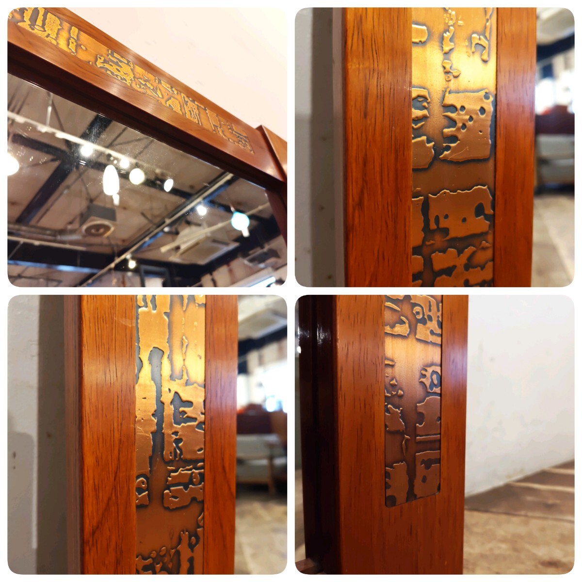 チーク材フレームに銅プレートがあしらわれたシンプルモダンなミラー。