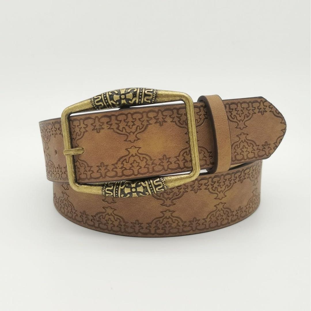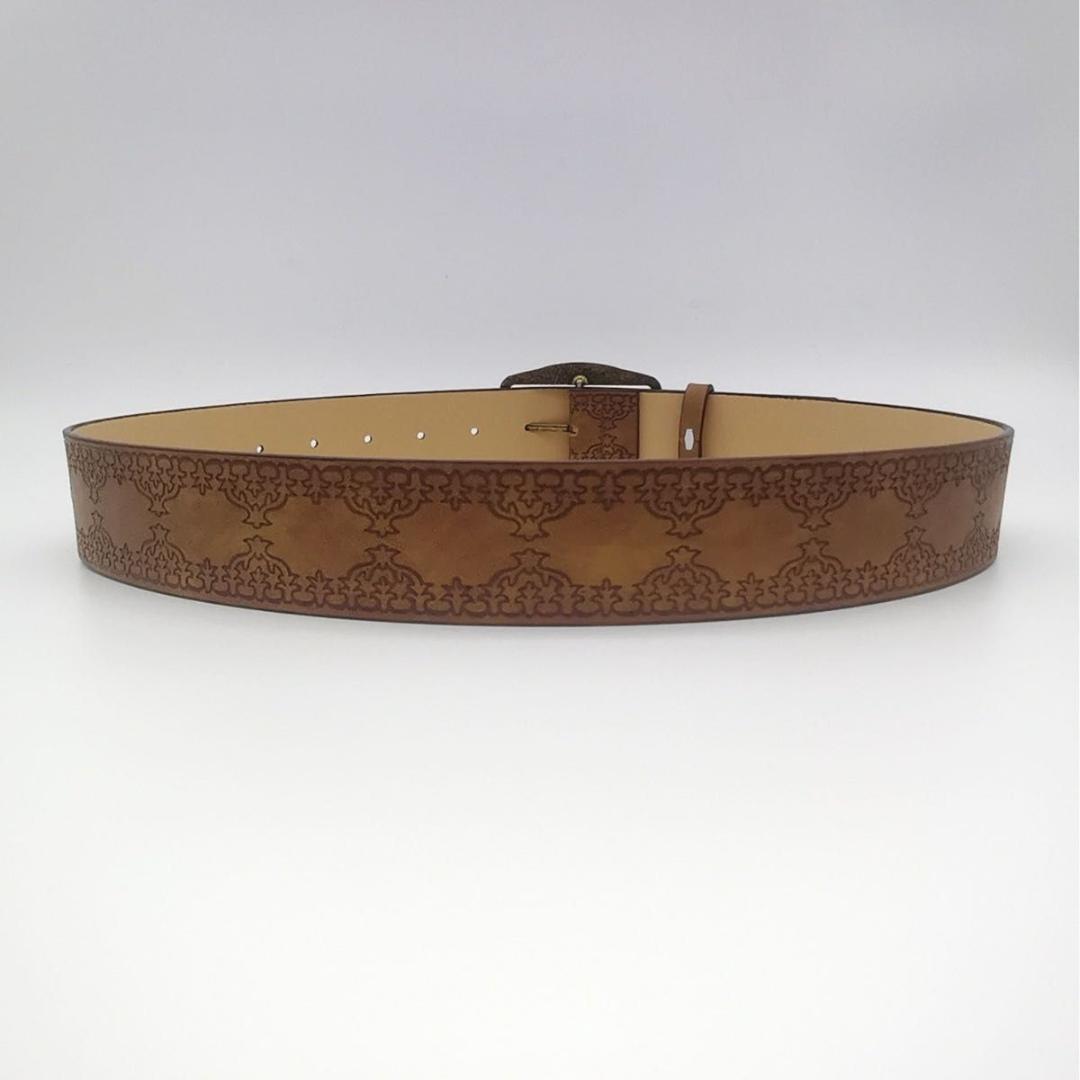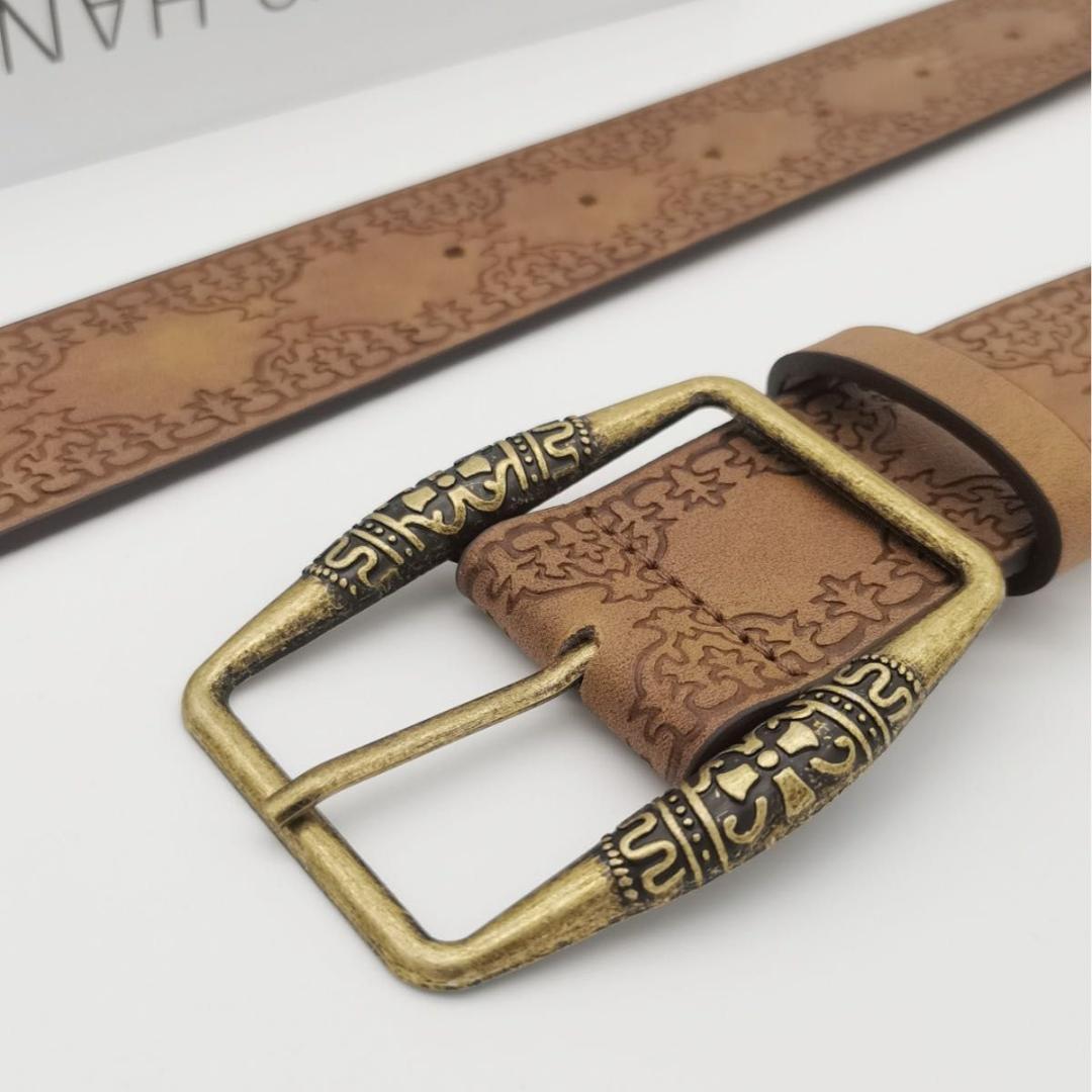 アンティーク調のコンチョがアクセントになったこのベルトは、デニムやチノパンと相性抜群。重厚感のあるデザインと程よいダメージ感で、ラフな着こなしにワイルドなエッセンスをプラスします。Y2Kファッションやストリートミックスにも◎