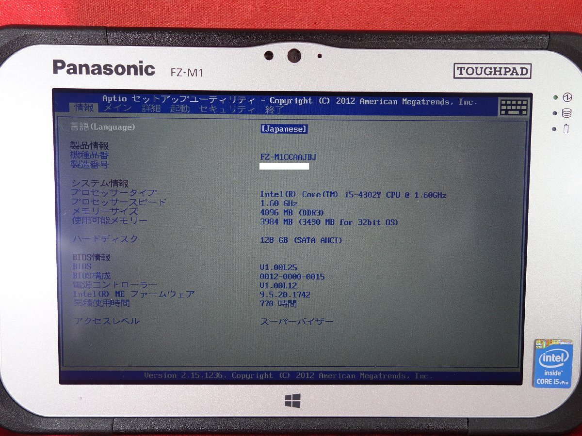 【Core i5-4302Y】 Panasonic FZ-M1 (FZ-M1CCAAJBJ)【BIOS確認済】 メモリ4GB/SSD128GB 中古 タブレット 【ジャンク】 PH250911-12