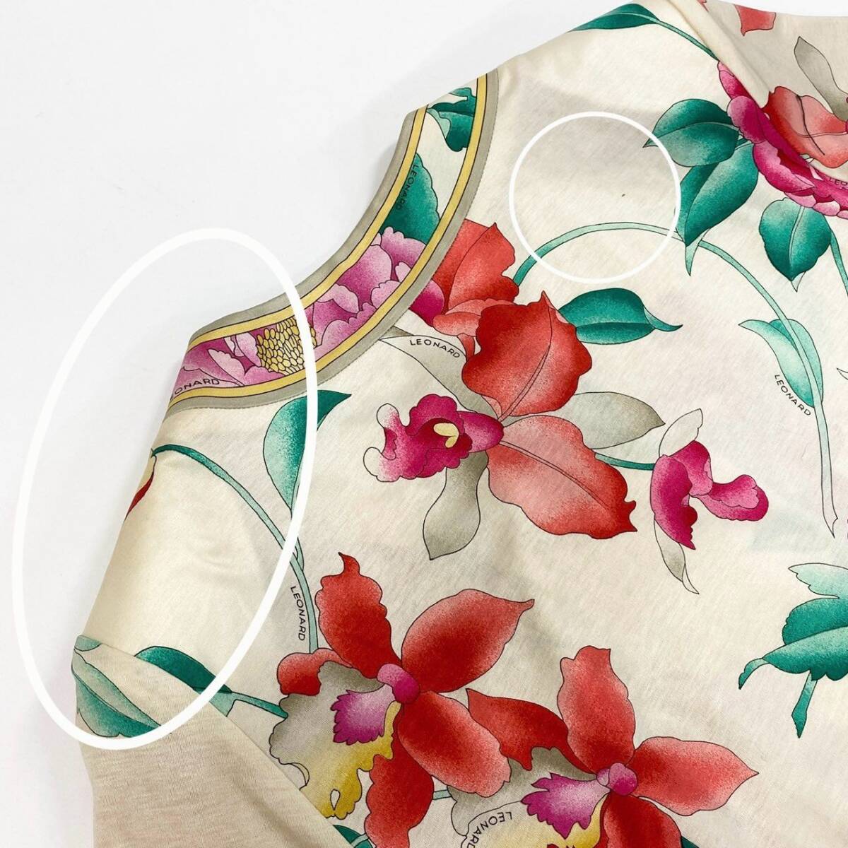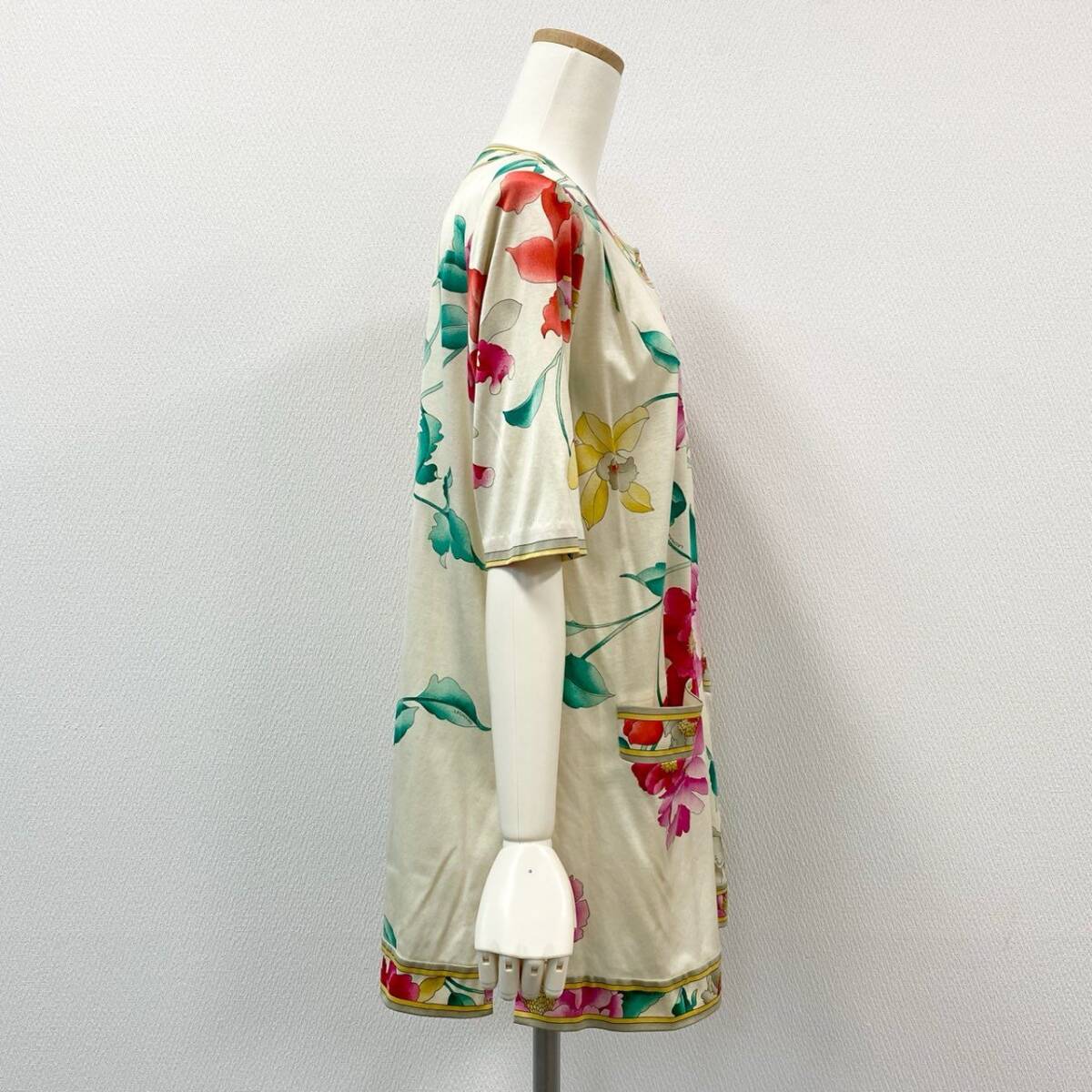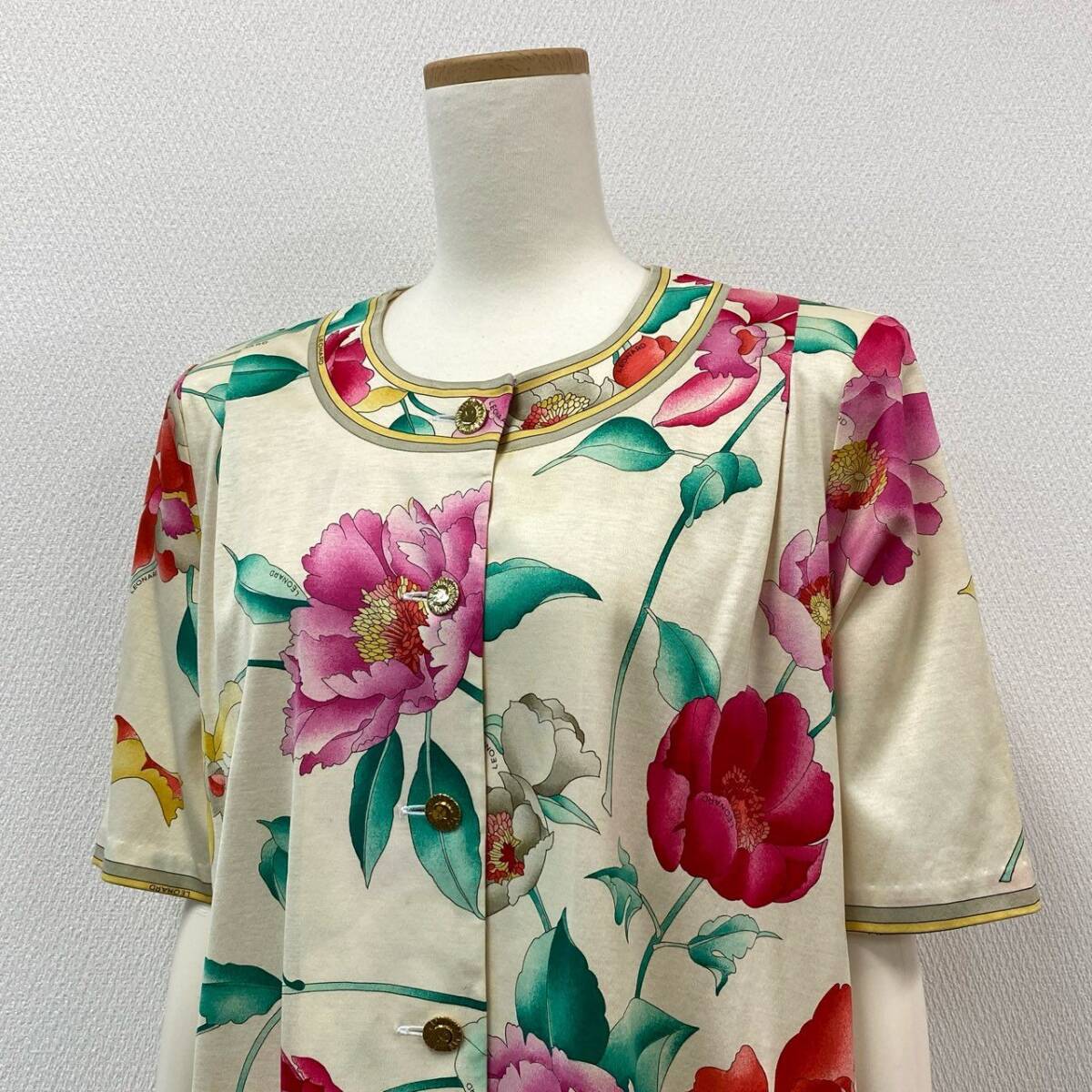 スタッフ商品コメント | レオナールらしい華やかなフラワープリントが目を惹く半袖チュニックです。アイボリーをベースに、ピンク・レッド・イエローの大輪の花柄が映えるデザインで、コットン素材のやわらかな風合いが特徴です。ゴールド調のボタンや縁取りのパイピングが上品さをプラスし、日常使いからリゾートやお出かけシーンまで幅広く活躍します。1枚で主役になる華やかさがあり、パンツやレギンスとの相性も抜群です。 |