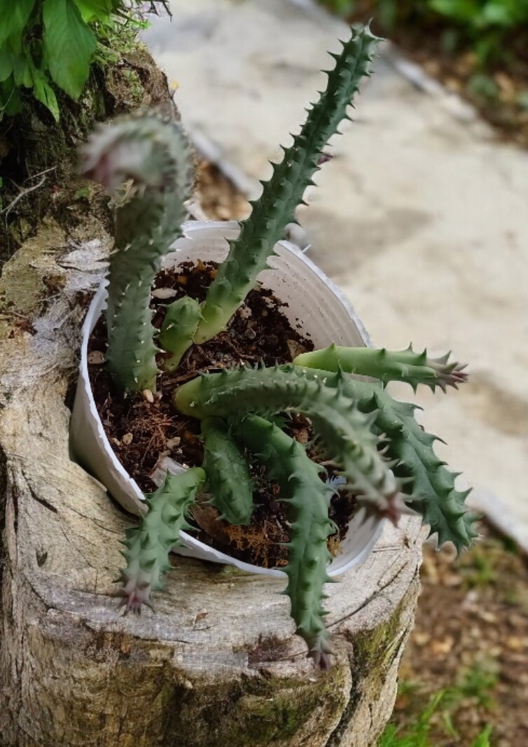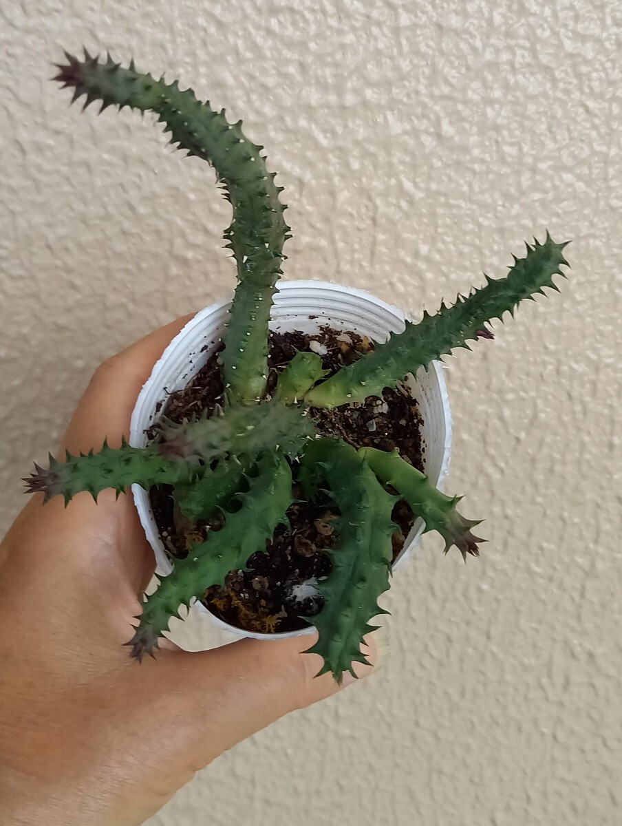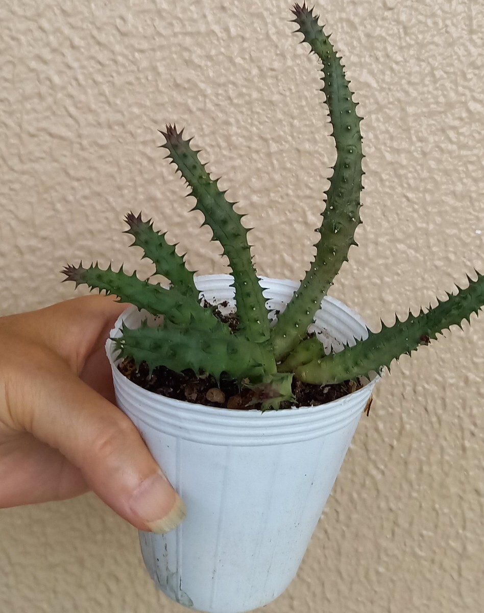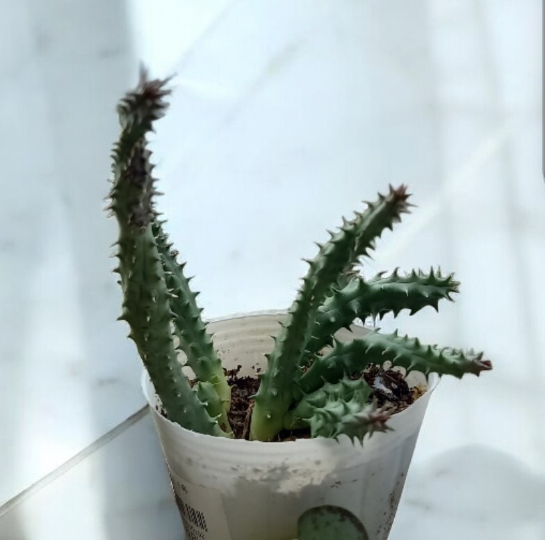 茎は肉厚で、とげのような突起があり、先端が赤みを帯びているのが特徴です。星形の花を咲かせます。