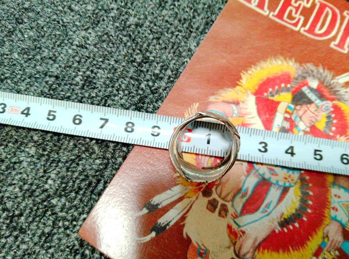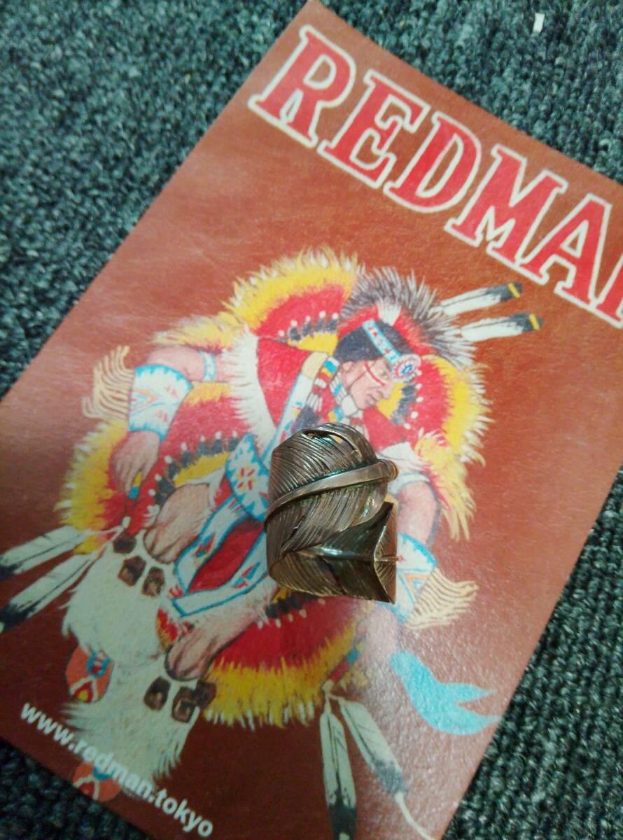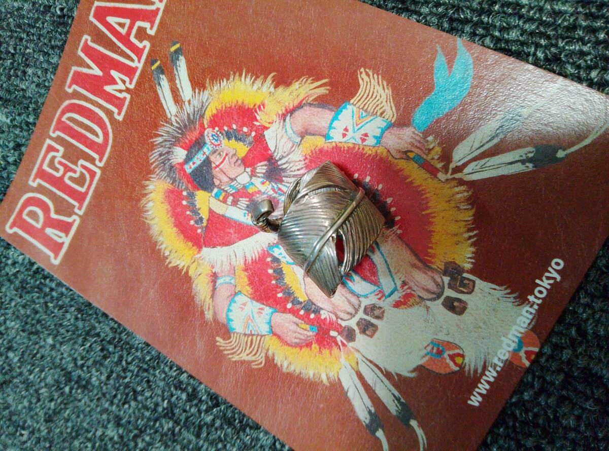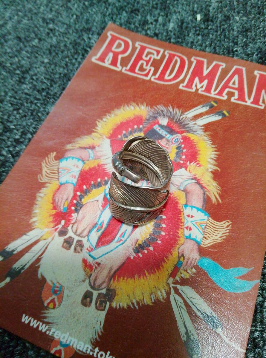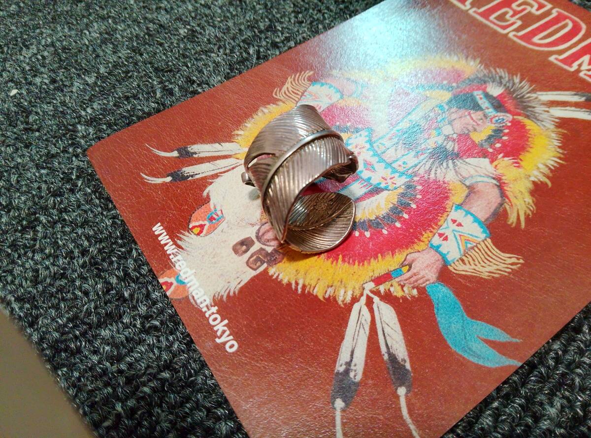 レッドマンのフェザーリングです。特大フェザーを螺旋状に巻いた大きなフェザーリングで、縦に長い形状になっているためサイズを正確に計測するのが難しいです。おおよそ17,18,19号前後のサイズ感だと思いますが、フリーサイズのため微調整可能です。ネコポス簡易梱包です。