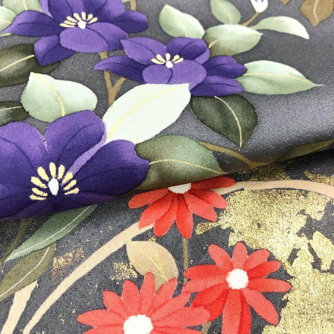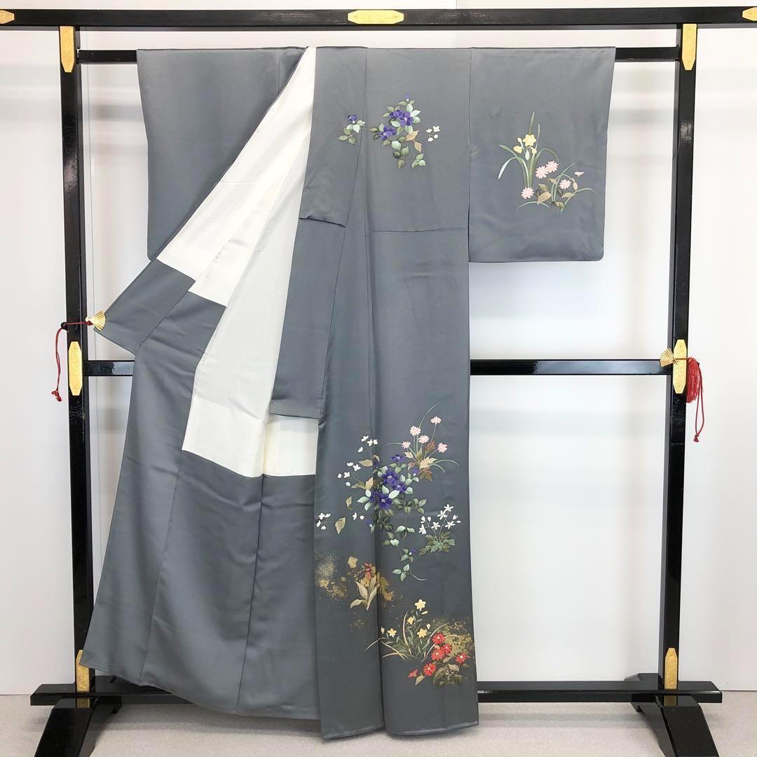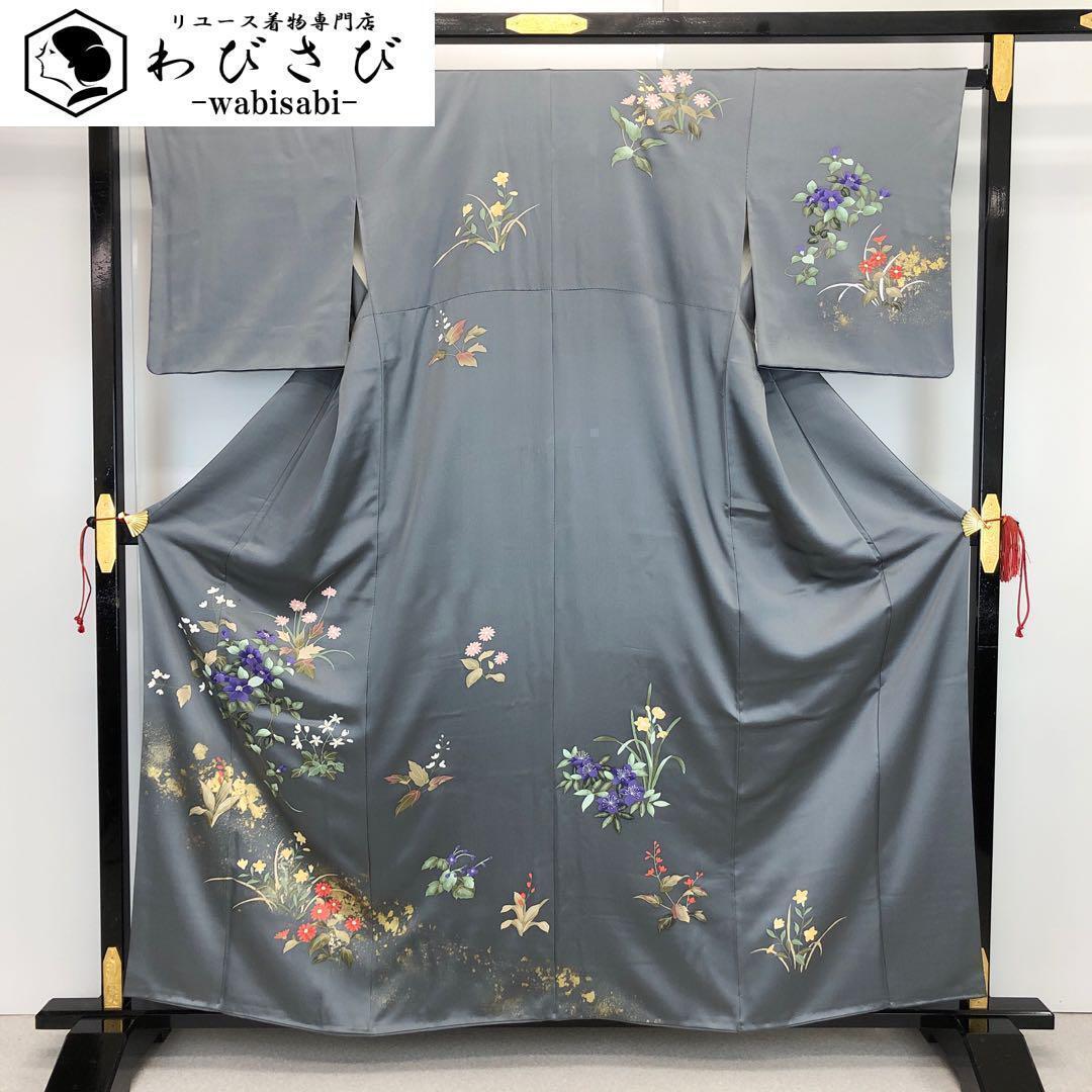 付下げ 美しい四季の草花模様 手描き 金彩 薄鈍色 K-3452 着物 きもの kimono 和服 和装 中古 リサイクル着物 【送料無料】