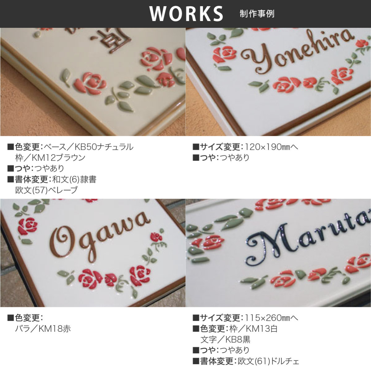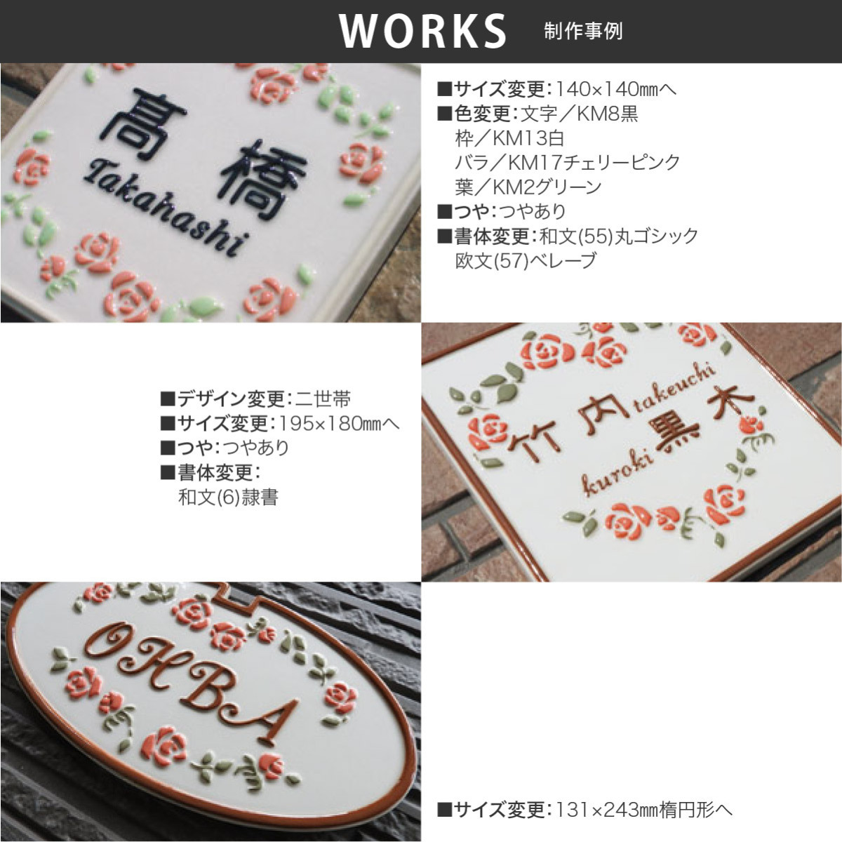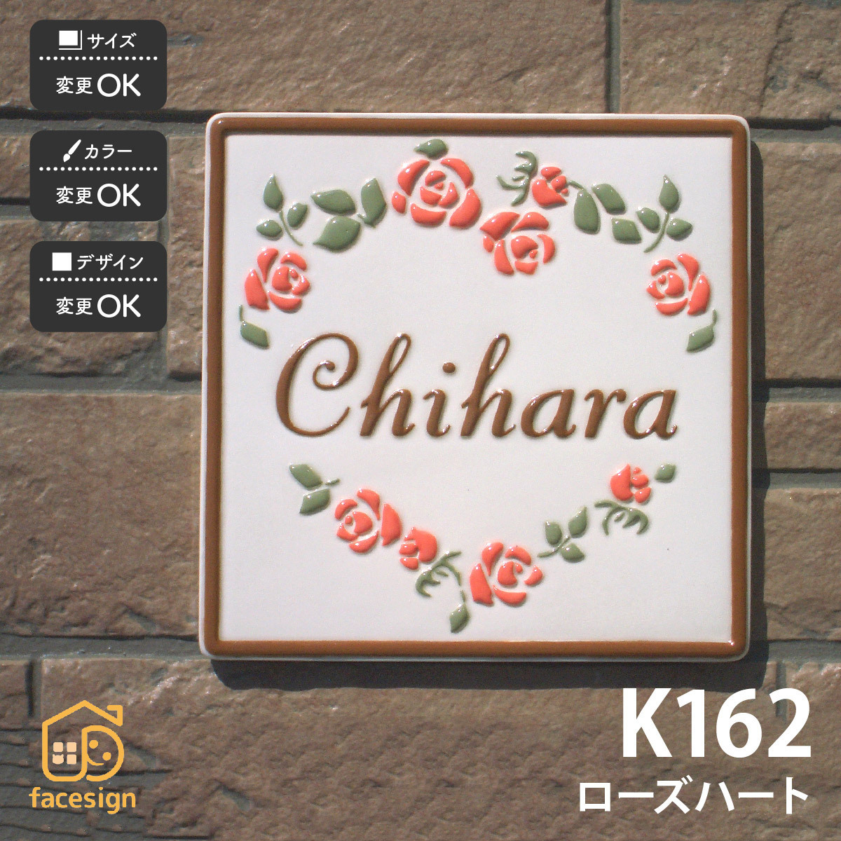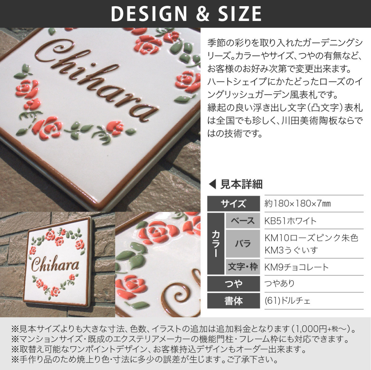商品詳細 | 季節の彩りを取り入れたガーデニングシリーズ。カラーやサイズ、つやの有無など、お客様のお好み次第で変更出来ます。ハートシェイプにかたどったローズのイングリッシュガーデン風表札です。縁起の良い浮き出し文字(凸文字)表札は全国でも珍しく、川田美術陶板ならではの技術です。 |