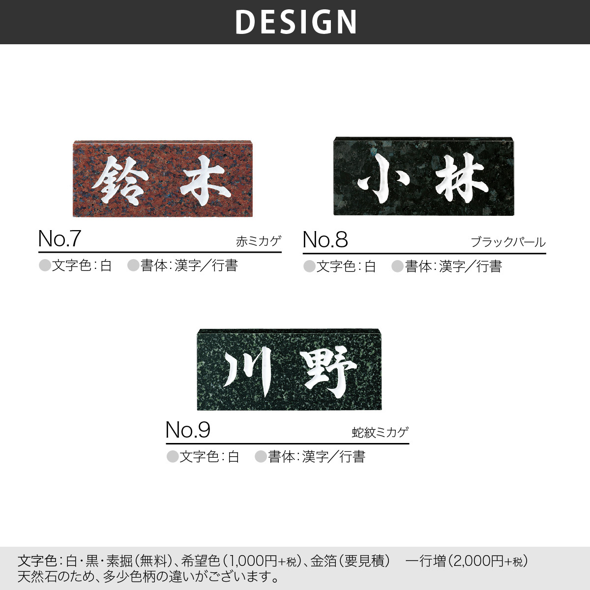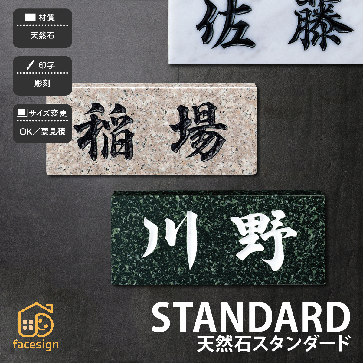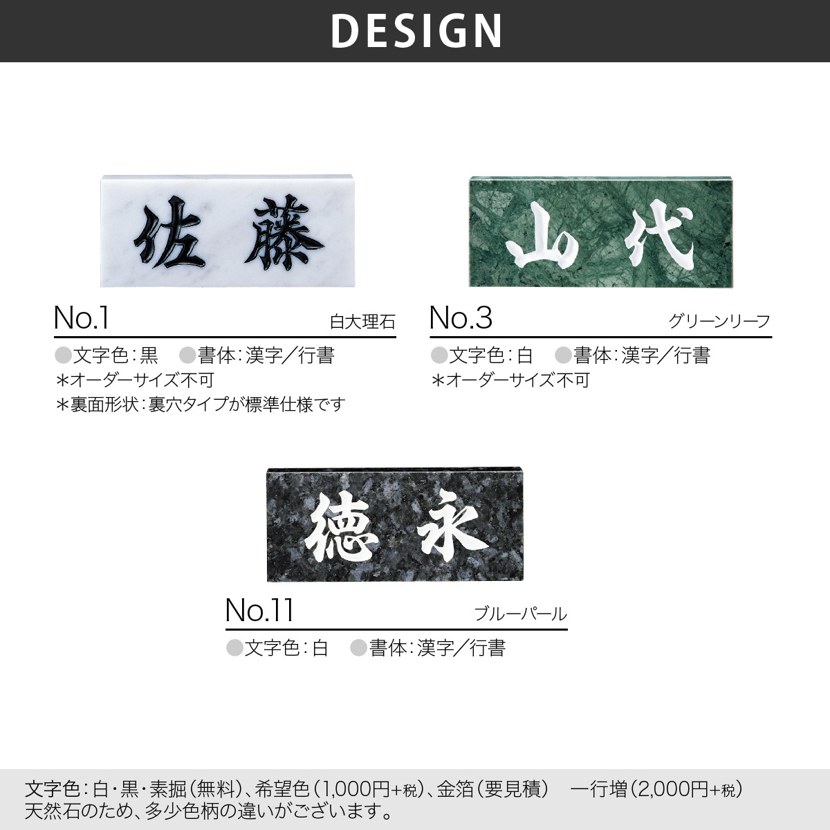 | 商品詳細 | 表情豊かな天然石の味わいを生かした演出。住まいの雰囲気に合わせてお選びいただけます。オーダーサイズでも製作可能ですのでご希望のサイズがある場合はお問い合わせください。金額はご注文完了時に変更いたします。*文字の大きさ、形によっては製作できない場合がございます。 |
