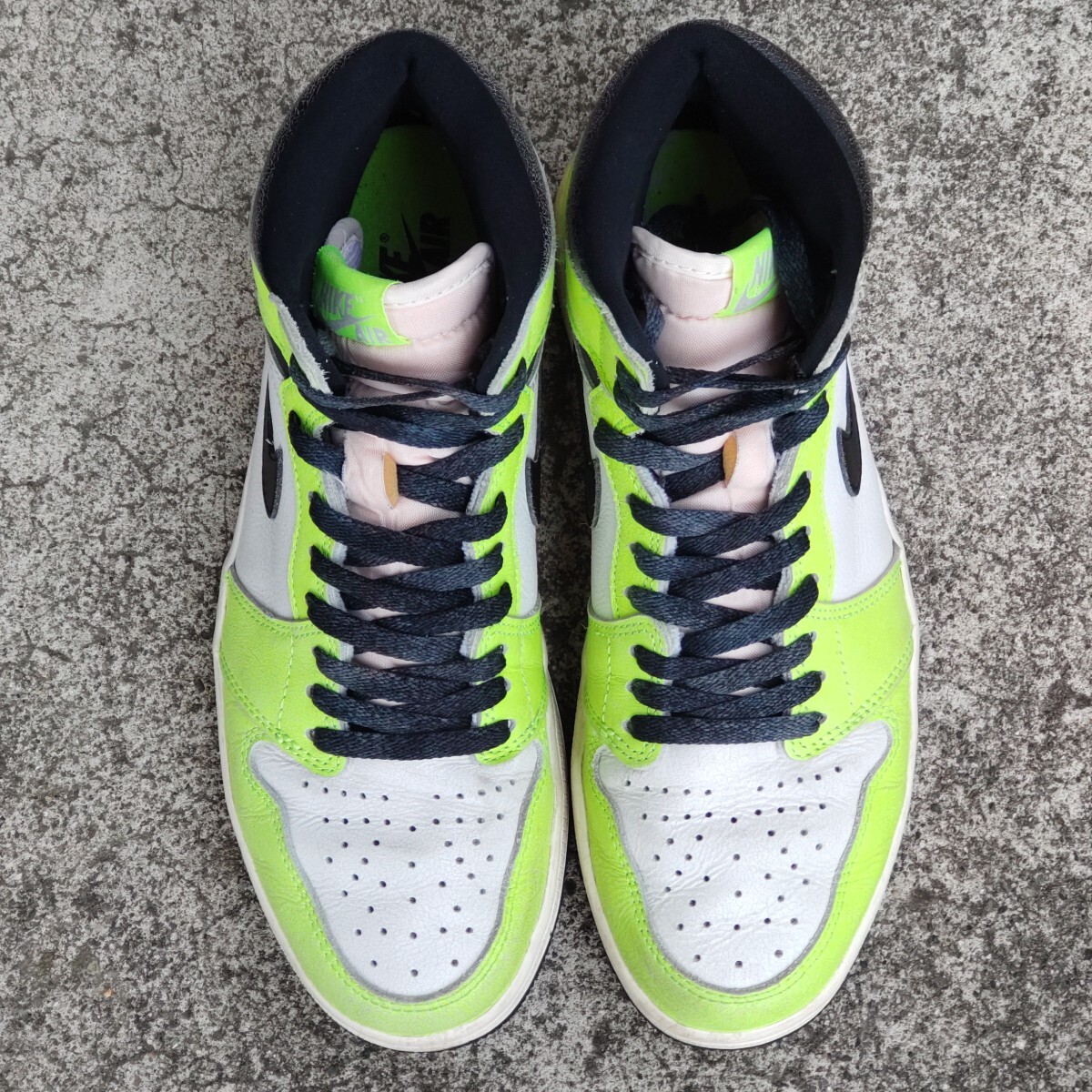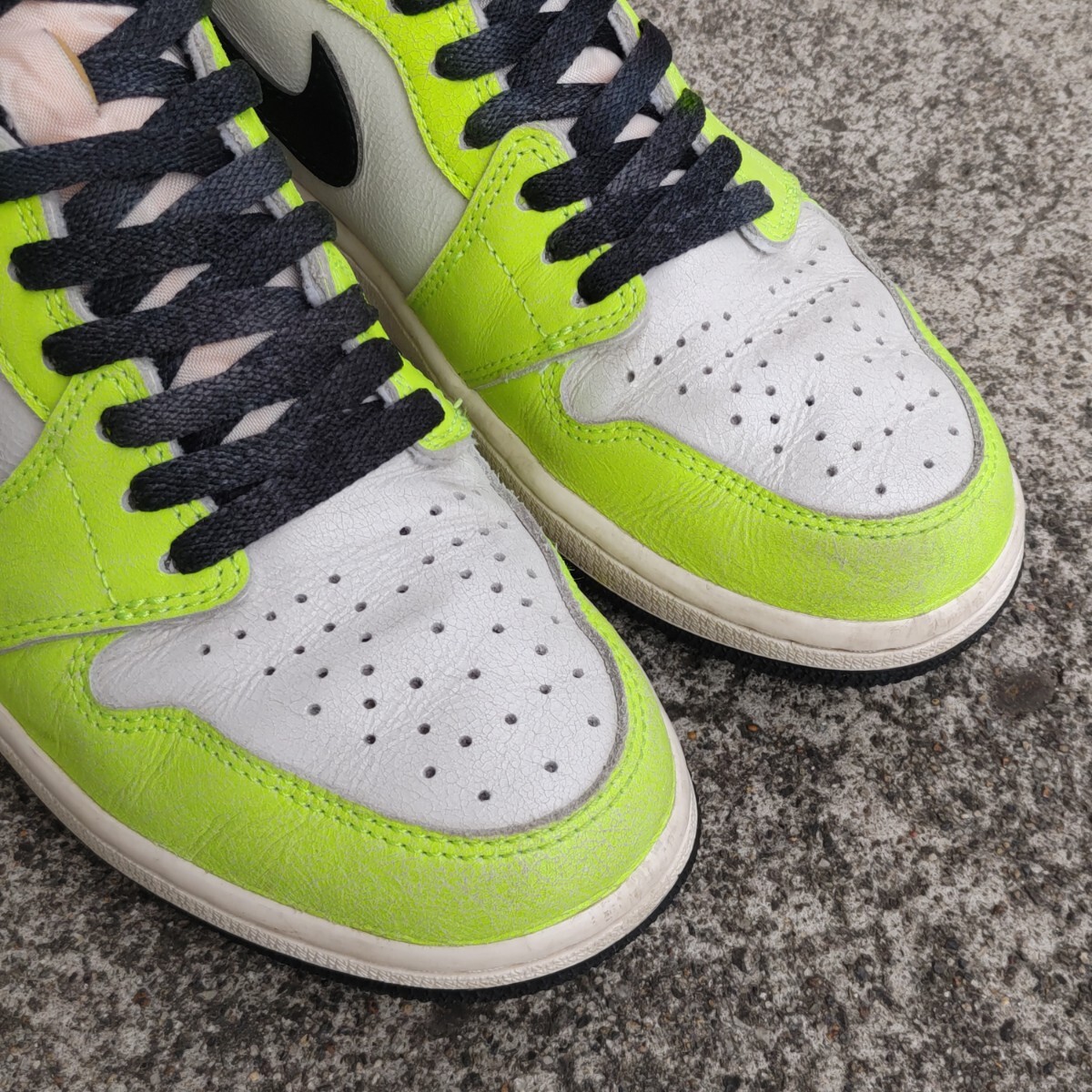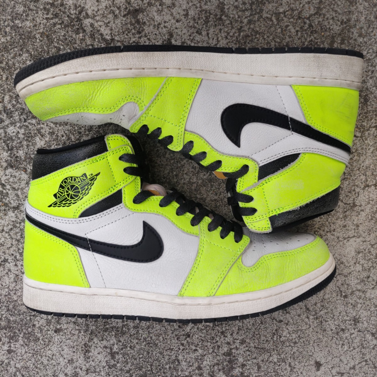 ●ブランド:NIKE (ナイキ) ●モデル名:AIR JORDAN 1 RETRO HIGH OG (エア ジョーダン 1 レトロ ハイ オージー) ●品番:555088-702 ●発売時期:2022年7月ごろ ●素材:天然皮革+合成繊維 ●生産国:中国 ●色:ボルト/ブラック/セイル ●状態:中古箱無し ●サイズ:JPN 27.0cm | USA 9.0 ●サイズ構造について 少し横幅の狭い構造となっております。 サイズ感はあくまで出品者の感覚です。サイズ感に関しましては個人差が御座います。 ●コメント 2022年に発売された「AIR JORDAN 1 RETRO HIGH OG」の中古品。 ネオンカラーを採用したド派手なカラーリングが印象的なモデル。 SWOOSHとアンクルパットにはヴィンテージ感を演出したクラック加工が施されております。 左右のつま先に擦れた傷があります。 左右の踵(特に左足)に擦れた傷があります。 ライニングには少し毛玉が有ります。 インソールのプリントはほとんど残っています。 靴紐は別紐を使用していたので未使用です。 黒タグと替紐も有ります。 アウトソール踵の外側の溝が擦り減って薄くなっています。(画像9枚目参考) ●備考 国内代理店の正規品です。 画像に有るものが全てとお考え下さい。 中古品のため商品画像や説明を良く確認の上でご入札をお願いします。 箱付きですが箱には擦れや凹みが少し有ります。 輸送過程で汚れや傷が付く可能性が御座いますがご理解下さい。 商品を確認出来ないお取引の特性から繊細な方や神経質な方は入札しないで下さい。 製造過程の縫製のズレや歪み・汚れ・傷・付着接着剤に関しましてはご容赦下さい。 不明点や確認点は質問して回答を確認し解決してからご入札下さい。 ディスプレイ機器やご観覧環境で画像と実物で色合いが異なる場合が御座います。 色合いが気になる場合は品番をネット検索して他の画像の色合いも確認してみて下さい。 このブランドのサイズ構造に認識が無い方は入札はしないで下さい。 天然皮革部分は素材特性から左右で質感が異なる場合が御座います。 ★Yahoo!かんたん決済以外の支払方法は対応しておりません。 ★決済(お支払い)は落札日から4日以内の完了でお願いします。 ★領収書の発行は出来ません。