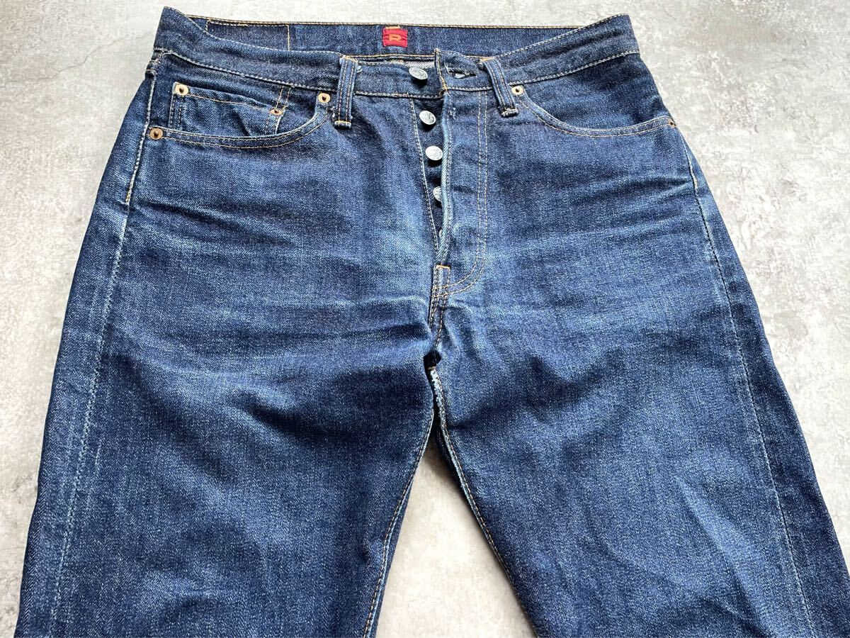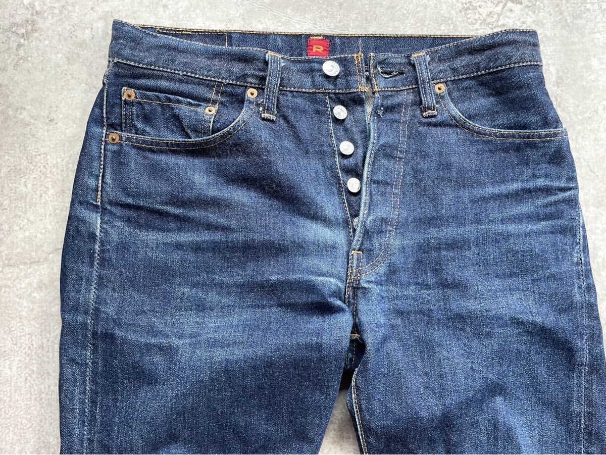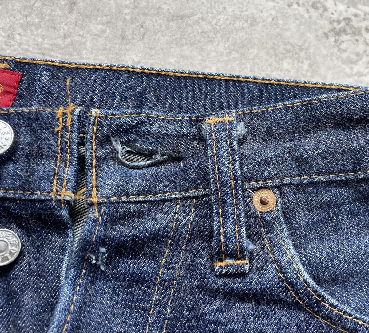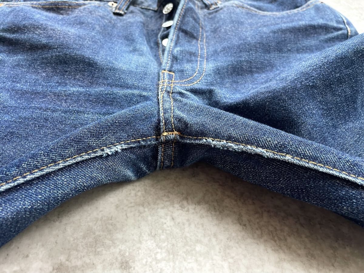 使用感、多少色落ちがあり、フロントボタン付近に小さいほつれ、股下にスレがあります。