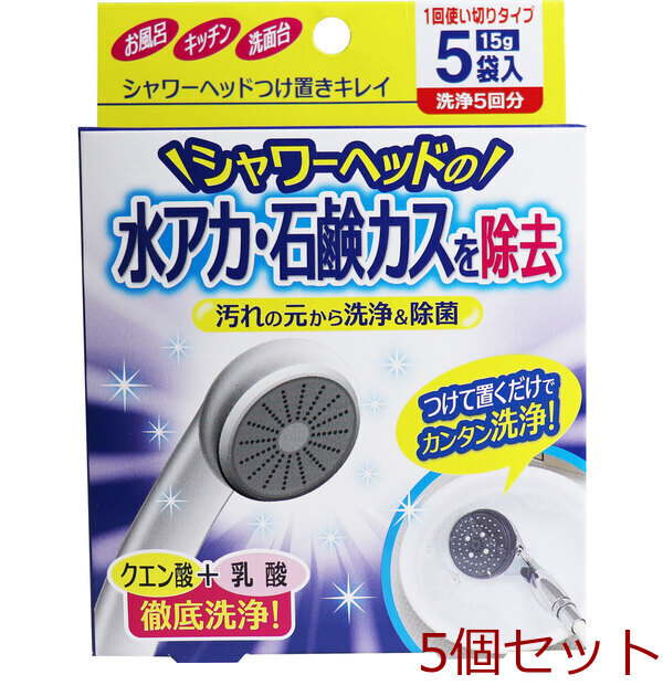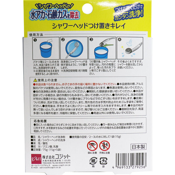 汚れの元から洗浄&除菌! つけて置くだけカンタン洗浄! つけて置くだけで、シャワーヘッドの汚れを元から洗浄&除菌! おうちのシャワーヘッドをしっかりお掃除! ・クエン酸+乳酸で徹底洗浄。 ・洗浄液につけて置くだけ。 とってもカンタン。 ・水アカや石鹸カスをしっかり落とします。 ・お風呂やキッチン、洗面台に。 いつも気に掛けない場所もしっかりお掃除! 個装サイズ:105X140X22mm 個装重量:約94g 内容量:洗浄5回分(15g×5袋) 製造国:日本 【発売元:株式会社コジット】 【品名】 シャワーヘッドの洗浄剤 【用途】 シャワーヘッドの洗浄 【液性】 酸性 【成分】 クエン酸、乳酸 【使用量の目安】 2~3Lの水に対して1袋(15g) 【使用方法】 (1)バケツに2~3Lの水を入れ本品1袋を入れて溶かし、洗浄液を作ります。 ※40度前後のぬるま湯を使用するとよく溶けます。 (2)洗浄液にシャワーヘッド全体が浸るようにつけ置きします。 ※洗浄目安時間:約1時間 (3)つけ置き後、シャワーヘッドを取り出し、汚れの程度によって残った汚れをブラシ等でこすり落としてください。 (4)その後よく水ですすぎ、シャワーを数分流してからお使いください。 【注意】 ・本品は食べられません。 お子さまの手の届く場所に置かないでください。 ・本品使用の際、アルミ製のバケツは使用しないでください。 変色などの原因となります。 ・熱湯は使用しないでください。 ・他の洗浄剤と併用・混合はしないでください。 ・開封した個装袋は使い切ってください。 ・本品が固まっている場合は、袋の外側からもみほぐし、砕いてお使いください。 ・汚れがひどく、洗浄の効果が充分に発揮されない場合は、つけ置き後にブラシなどでのこすり洗いをおすすめします。 ・皮膚についた時は、流水で洗い流してください。 また、荒れ性の方は手荒れ防止のためゴム手袋をご使用ください。 ・使用後は、手を水でよく洗いクリーム等でのお手入れをおすすめします。 ・本品の粉が舞って吸い込んでしまう恐れがありますので、飛び散りにはご注意ください。 ・直射日光及び、高温多湿になる場所を避け、冷暗所に保管してください。 ・用途以外には使用しないでください。 【応急処置】 ・目に入った場合はこすらずにすぐに流水で洗い流してください。 ・万一飲み込んだ場合は無理に吐かせず、口をすすぎ、水を飲ませるなどの処置を早急に行ってください。 いずれの場合も応急処置後は速やかに医師に相談してください。 注意事項 予告なく成分・パッケージが変更になることがございます。 予めご了承ください。 *予告なく成分・パッケージが変更になることがございます。予めご了承ください *ダンボールを使用して発送する場合には、入数以下の個数の場合、 中古ダンボールを使用する場合があり、ご注文の商品とは異なるダンボールになる場合があります。 あらかじめ、ご了承ください。 |