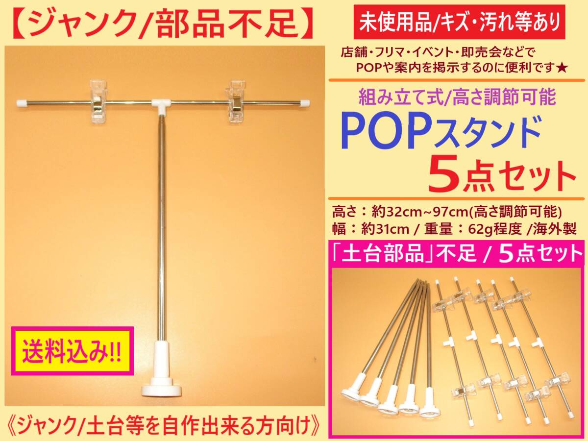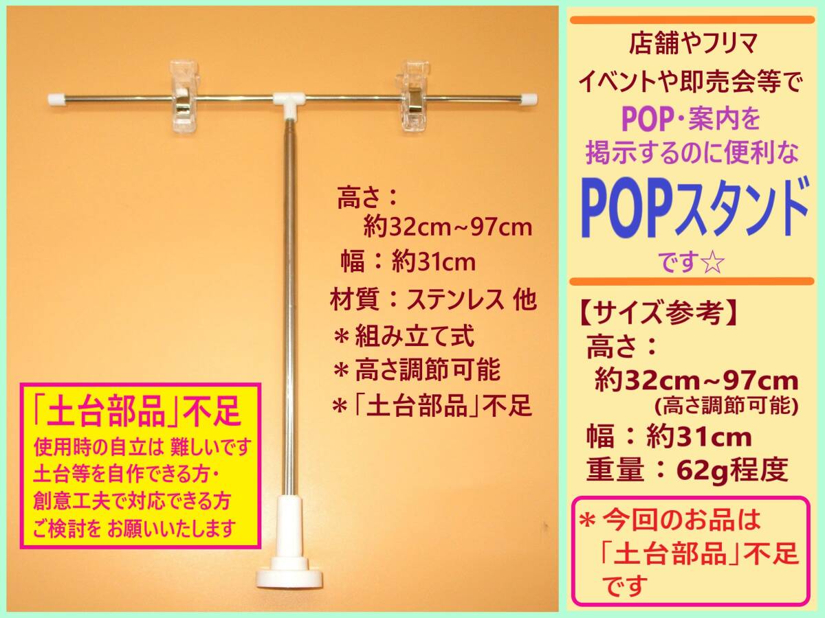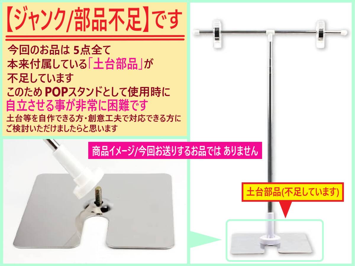 | 「ジャンク/部品不足」扱い の 未使用品です。 専用のパッケージなどの外装は、ありません。 本来は 店舗・フリマ・イベント・即売会などで POPや案内などを掲示しておくのに便利な POPスタンド 5点セット商品です。 高さが調節できますので A2/A3/A4/B2/B3/B4 等 様々なサイズのPOPを掲示する事ができます。 また 組み立て式ですので 持ち運びもしやすく 使用しないときには 収納も容易です。 今回のお品は 本来付属している「土台部品」が不足しています。 そのため このままでは スタンドを自立させる事が非常に困難です。 土台等を自作できる技術をお持ちの方、 DIYの材料等に使用したいという方、 その他創意工夫で対応できる方に ご検討いただけましたらと思います。 また 商品には スレ・傷・汚れ・作りの粗さ等が見られます。 以上の点より「ジャンク/部品不足」扱い として 安価にて出品いたします。 以下の商品説明をよくご覧になってから、 ご検討をお願い致します。 神経質な方、完品をご希望の方は、 御入札をご遠慮ください。 【商品内容】 POPスタンド 5点セット [基本的な仕様] *個々のお品で多少の差異あり サイズ:スタンド状態にて 高さ/約32cm~97cm(高さ調節可能)*クリップ含む 幅/約31cm 重量 1個あたり 62g程度 材質:ステンレス 他 その他: ・海外製/メーカー・耐久性等の詳細は 不明 ・組み立て式 ・A2/A3/A4/B2/B3/B4 等 様々なサイズに対応 ・「土台部品」不足のため 自立は困難 ・「クリップ部品」等の耐久性は未確認 *状態などは画像にてご確認ください *実際の商品の色味とは異なる場合があります *サイズ・重量・クリップの開き方など 個々のお品で多少の差異があります *商品画像は 基本的には 今回お送りするお品を 撮影しておりますが 画像2のみ 商品イメージとして 資料画像を使用しています あらかじめご了承ください 【状態等】 ・未使用品です。 ・専用のパッケージなどの外装は、ありません。 ・海外製の為、製造上のスレ・キズ・汚れ・ パーツ切断面の突起や"バリ"の残りなどの 作りの粗さが見られます。 美品・完品をご希望の方はご遠慮ください。 ・長期保存品につき、汚れ・埃の付着等がある 場合がありますが、御容赦下さい。 ・商品は、簡易チェック・簡易梱包とさせていただきます。 その為、不具合・欠け・割れ等の見落としがある場合がありますが、 当方ではそういった不具合に関しまして、サポートは一切いたしません。 あらかじめご了承下さい。 ・商品は、ごく簡易的に袋にまとめ、再利用段ボールに入れて発送いたします。 (参考:発送状態/画像10) 「ジャンク/部品不足」扱い で出品のお品です。 以上の点をご承知いただける方のみ、 ノークレーム・ノーリターンにて、ご検討下さい。 【補足】 「ジャンク」という表現は、 「本来の利用価値が損なわれた物」「正常な動作を保証しない物」 「保証対象外の物」を意味する言葉として使用しています | ||