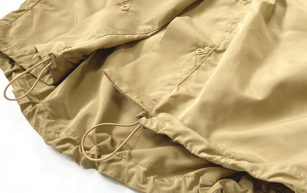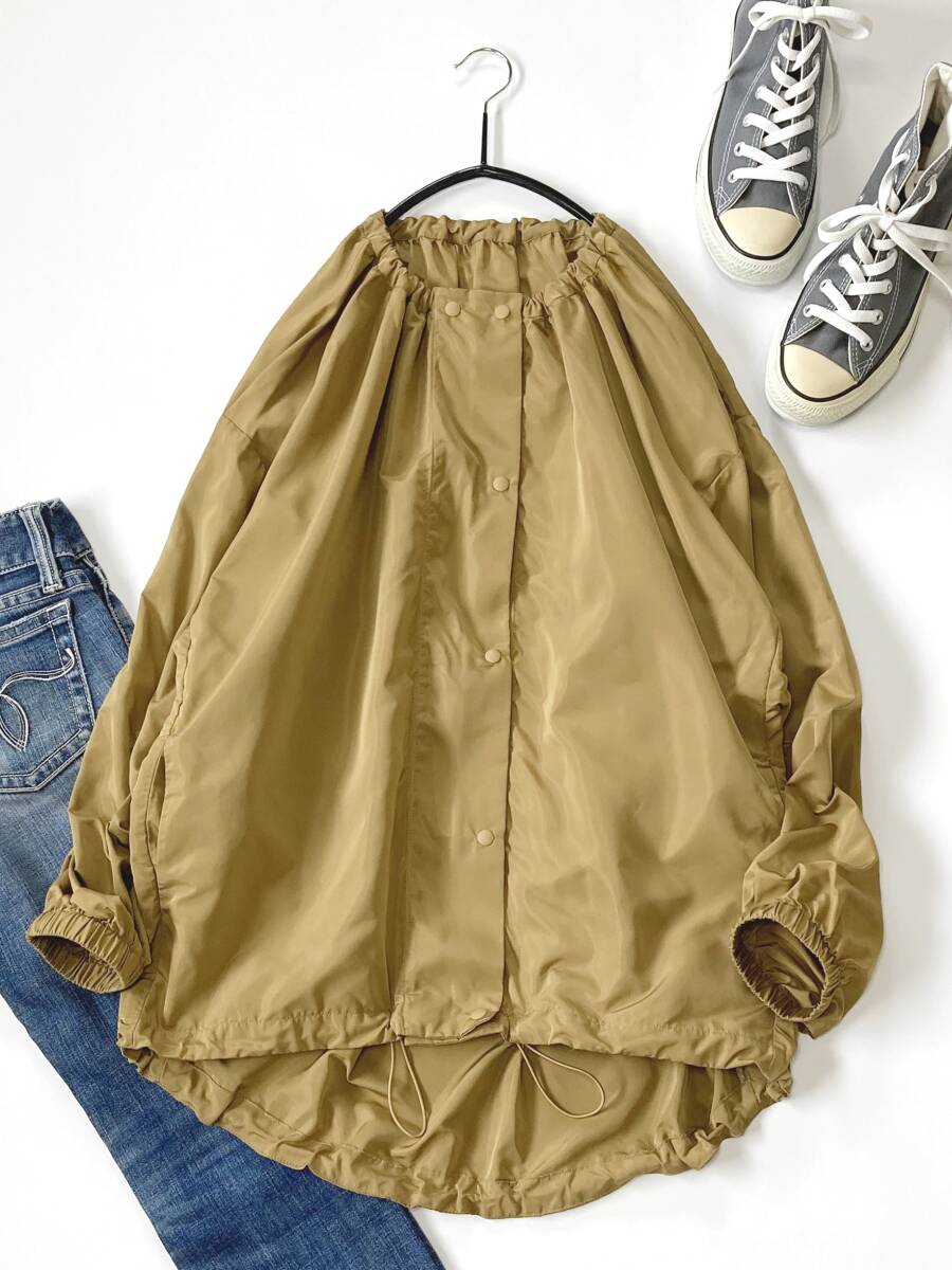 ツルっとしたカジュアルライクな素材で仕立てたノーカラータイプのブルゾンです。